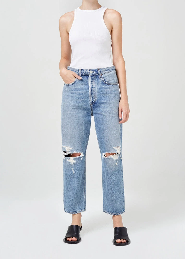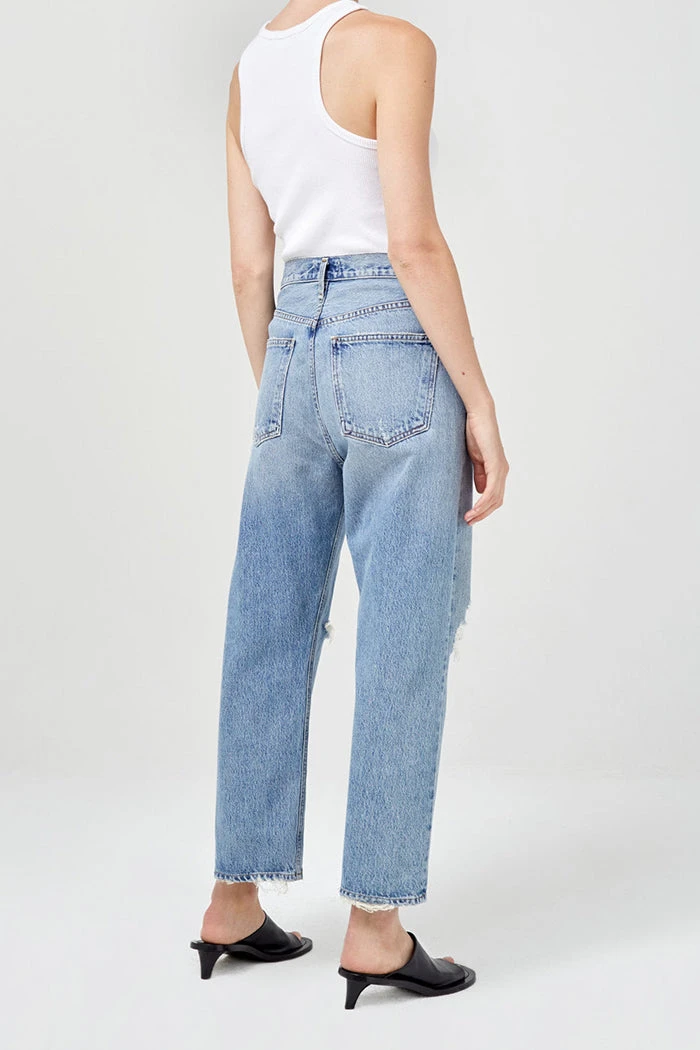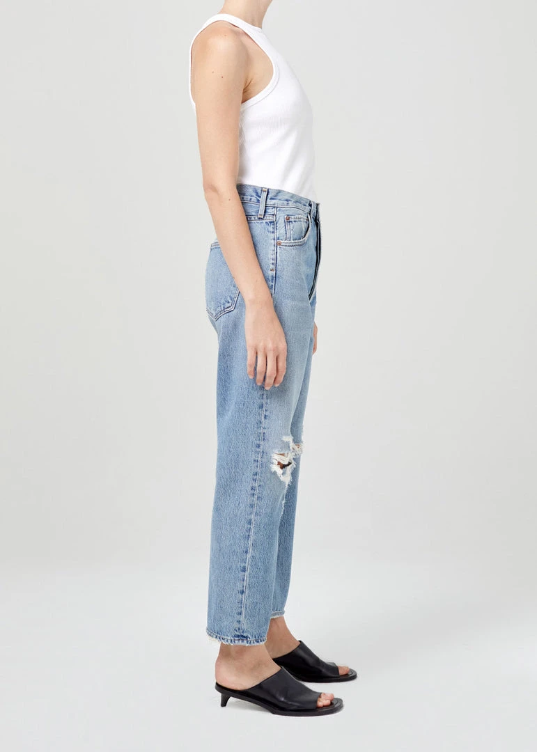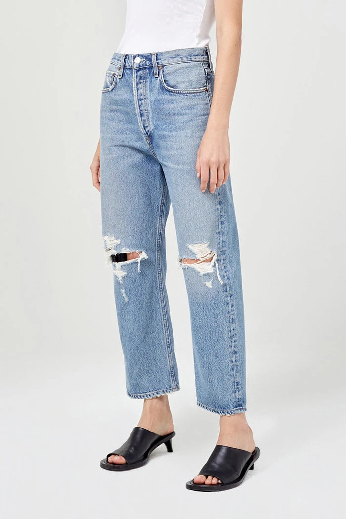 Agolde 90’s crop loose jeans in ripped vintage light blue suspend wash. A cropped version of the iconic 90’s jean. This decade inspired mid-rise is designed to sit relaxed on the waist with an eased up fit through the body. Non stretch denim. Button fly.