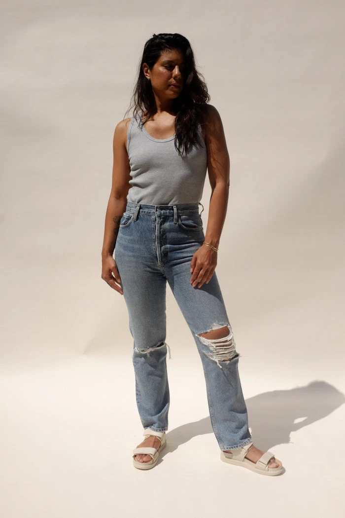 Agolde 90’s pinch waist in medium light blue wash with distressing. The perfect vintage inspired straight. Designed with a close-fitting high rise and easy, full-length straight leg. Button fly closure.