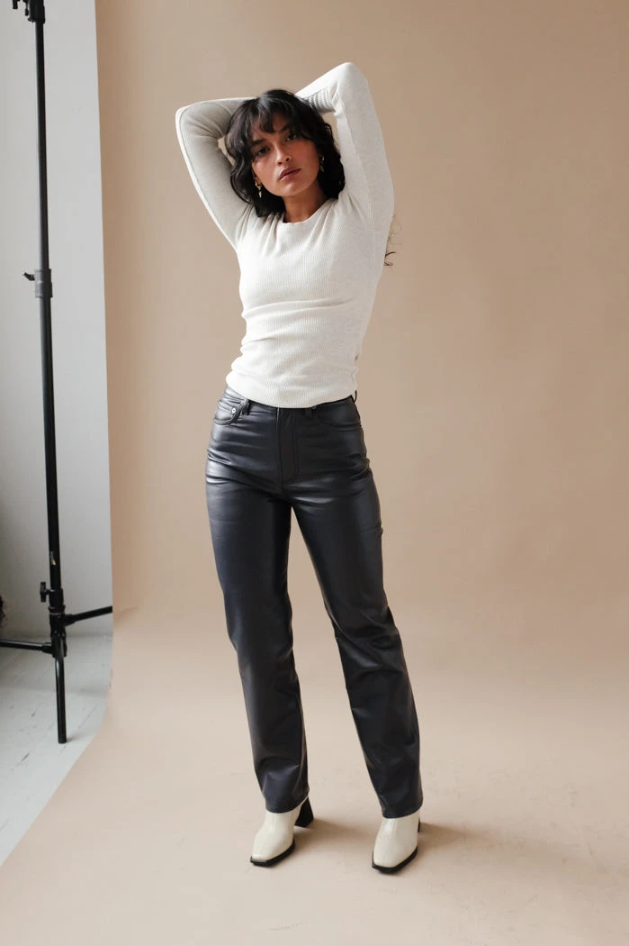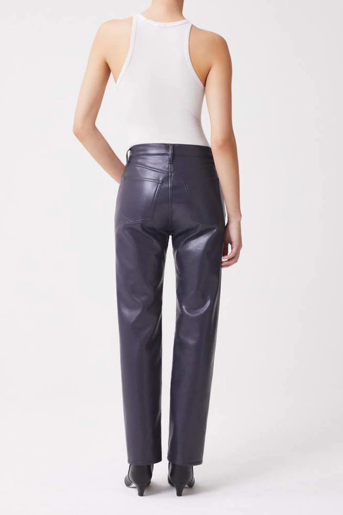 Agolde 90’s pinch waist shadow grey blue leather pants. This season is all about luxe leather. This perfect vintage inspired straight sits neat at the true waist with a close-fitting top block, finished with an easy leg and button fly. Crafted in a sleek grey blue, style yours with a tonal ribbed tank or leather shirt for a head-to-toe look.