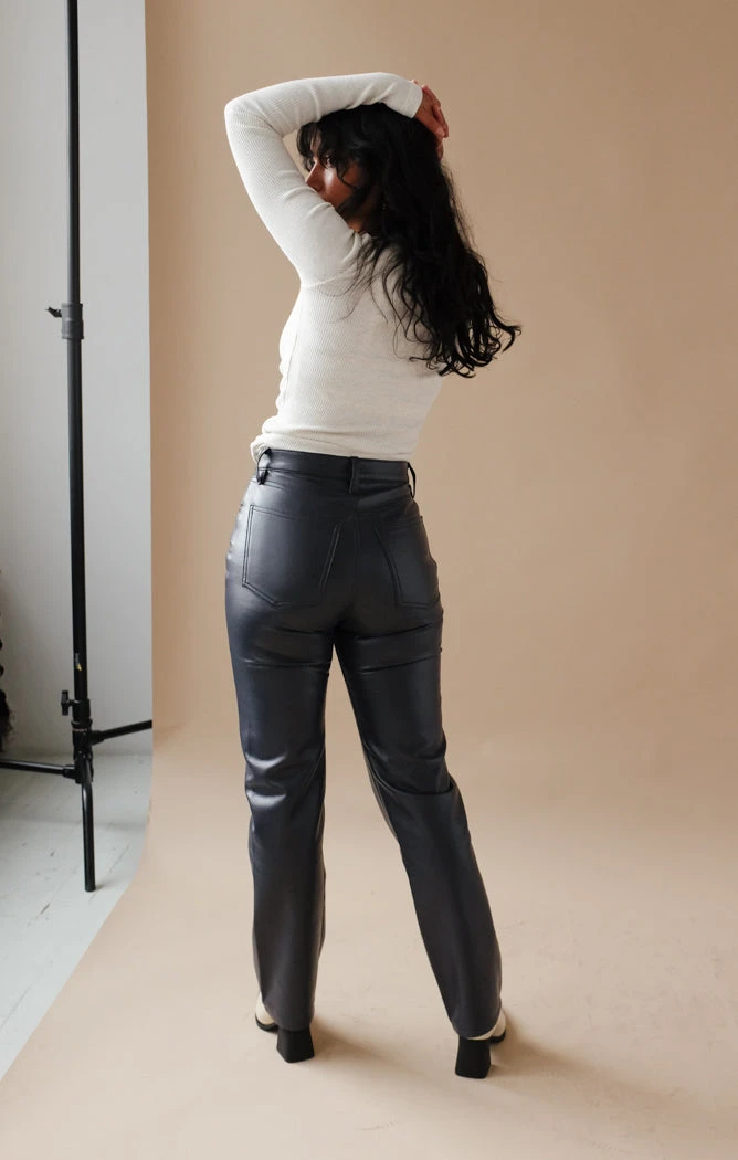 Recycled eco-leather that looks and feels like genuine leather with a fraction of the carbon footprint. Soft recycled leather. Five-pocket styling with button fly closure