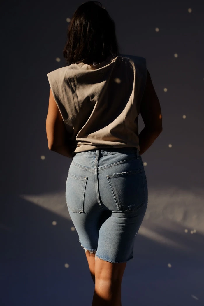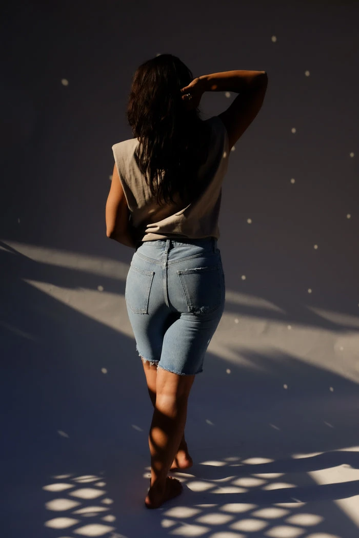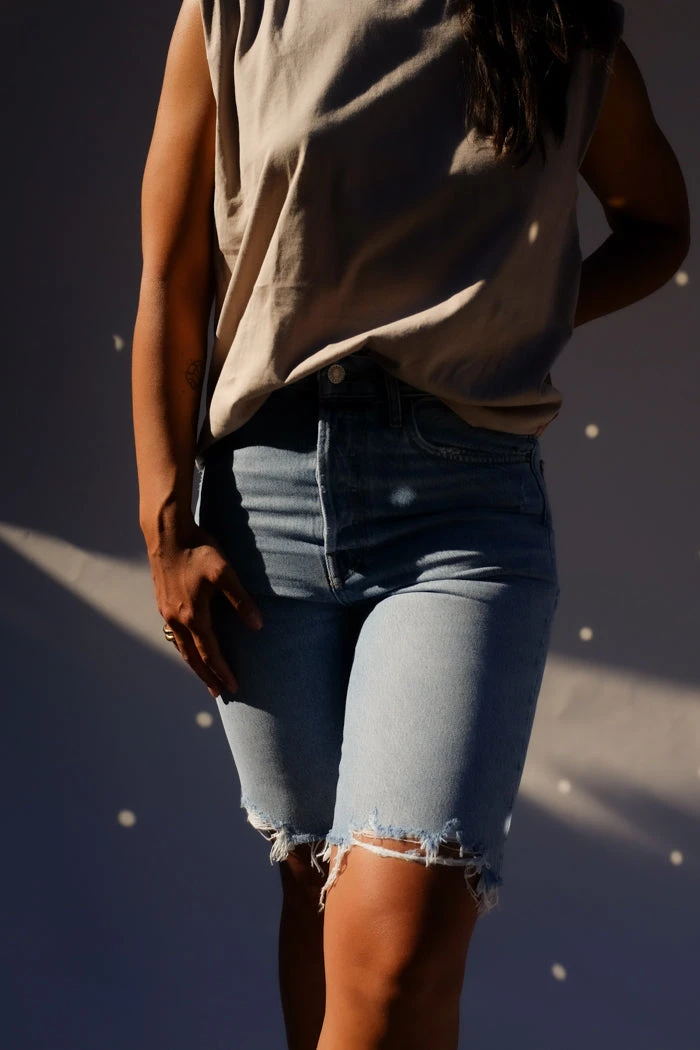 Agolde 90’s shorts in light blue swapmeet wash with light distressing. An easygoing staple. The 90’s Short is a warm-weather take on best-selling 90’s jean. Cut with a relaxed fit and raw hem just above the knee. Wear yours with a tank, vintage t-shirt or a blazer. Button fly.