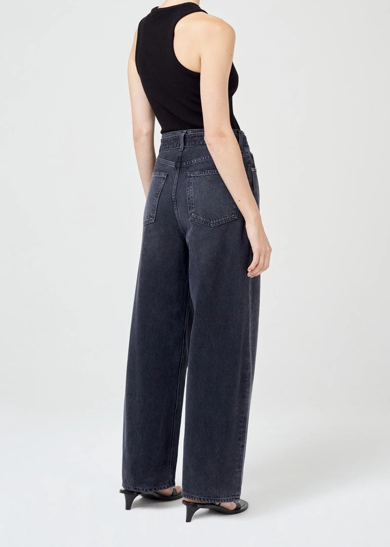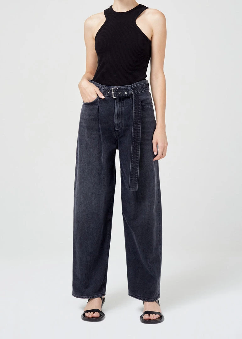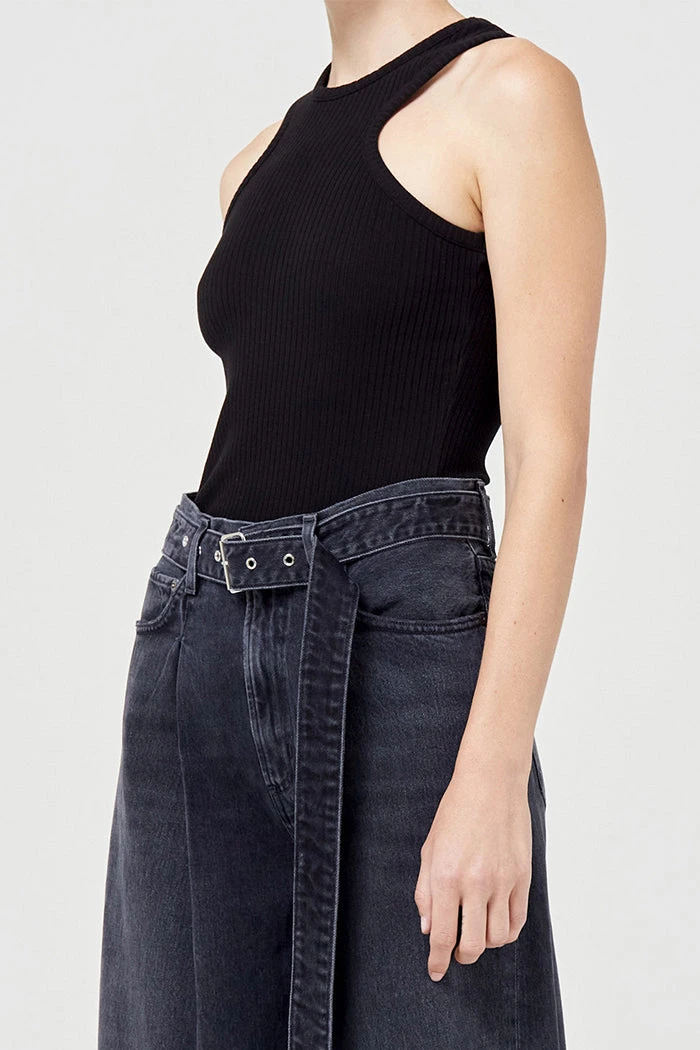 Agolde Bea cutaway ribbed tank top in black. Crafted from Agolde’s signature rib, the Bea tank features a distinctive neckline and fit that flatteringly hugs your frame. Midweight chunky rib.