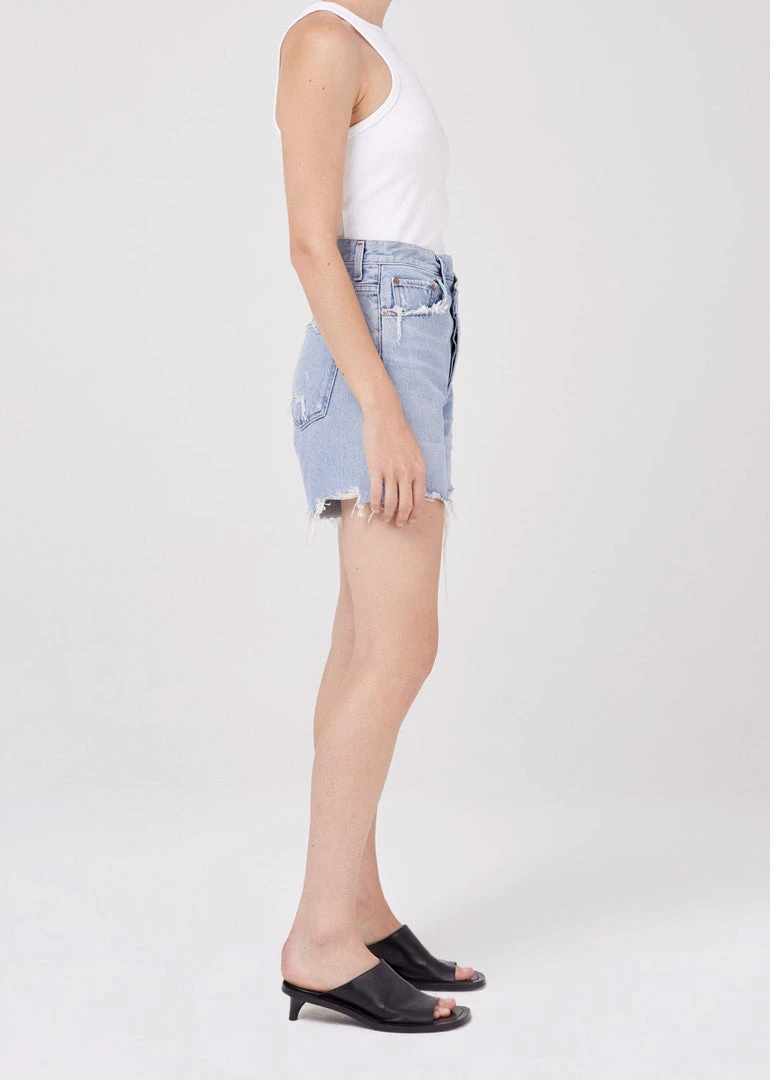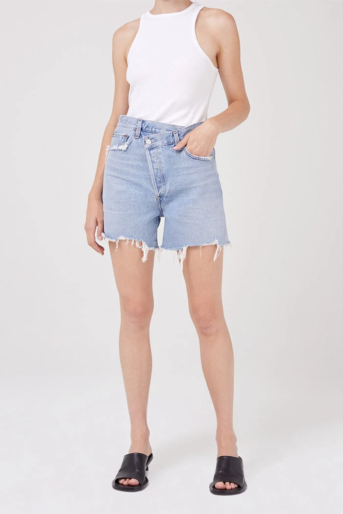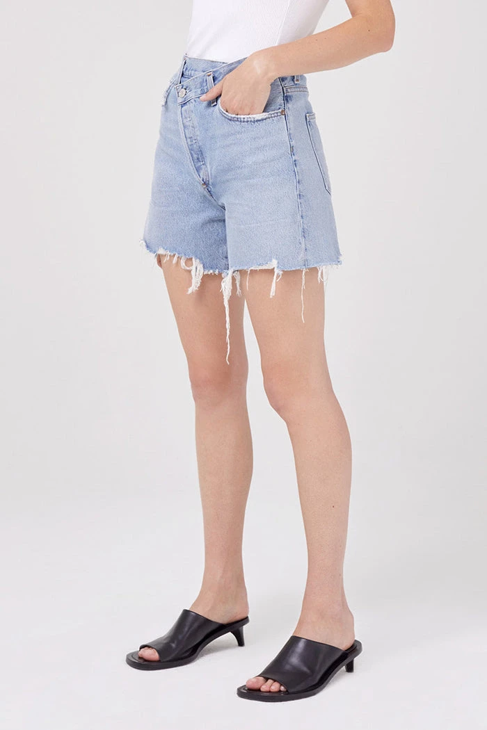 Agolde criss cross boyfriend fit denim shorts, in vintage symbol blue wash. Cut with an easy leg and unfinished hem. Can be styled rolled. Non stretch, button fly closure.
