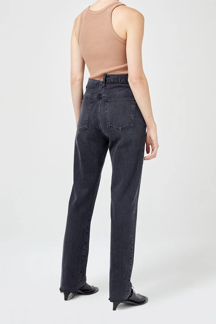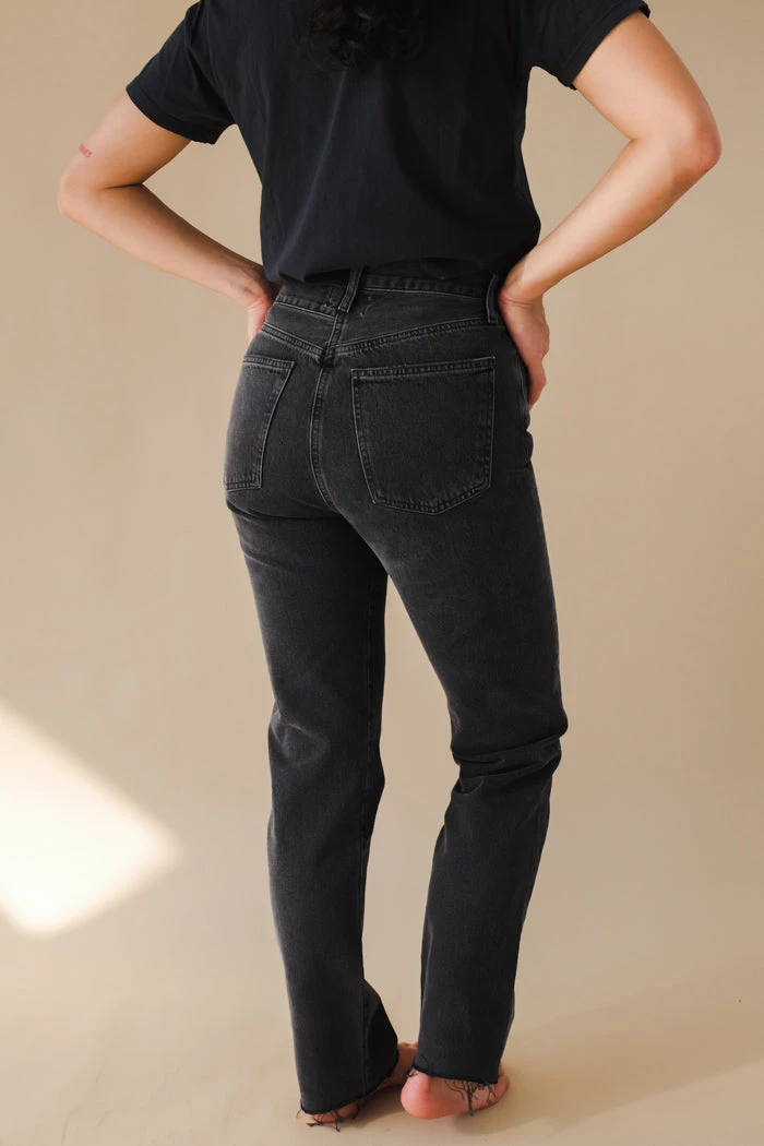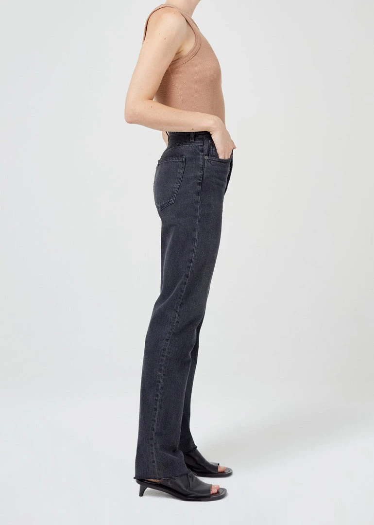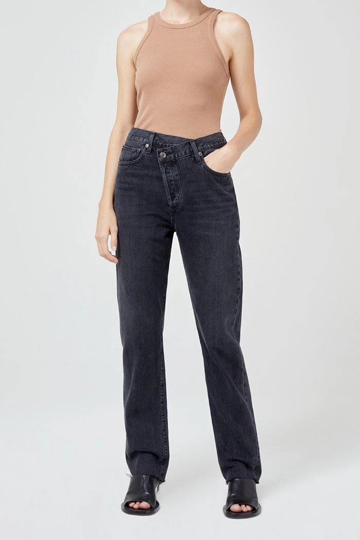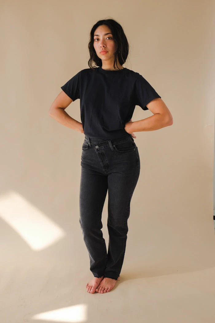 Agolde Criss Cross straight jeans in washed black shambles wash. An update to the best-selling criss cross fit. This true straight silhouette is cut with a high rise, offset back waistband and criss cross button-front detail. Light clean washed black, super soft non-stretch with a slight drape. Button fly.