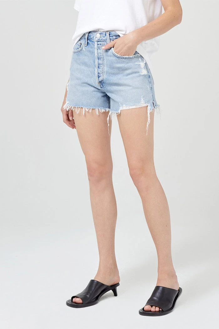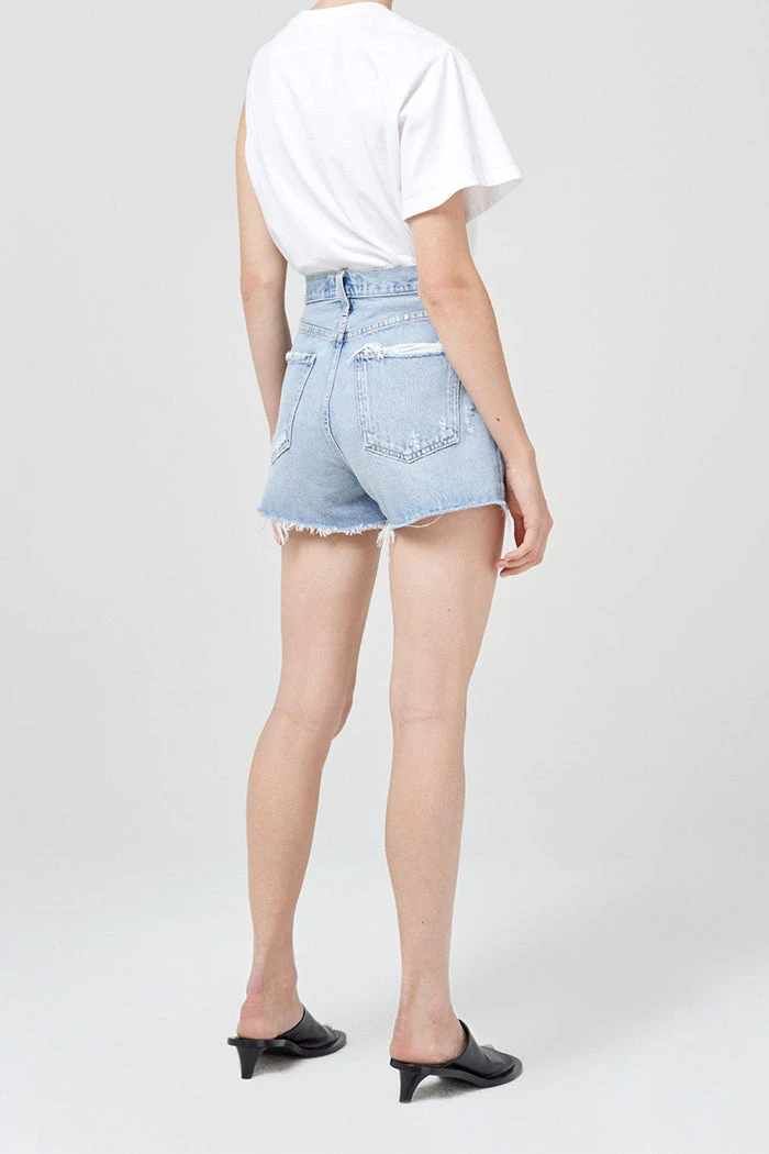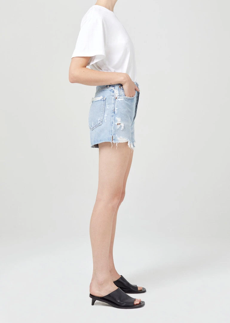 Agolde Dee super high rise cut off short in light blue muse wash. Ultra high rise short with a closer fit around the thigh crafted from rigid pure cotton. Non-Stretch. Button fly closure.