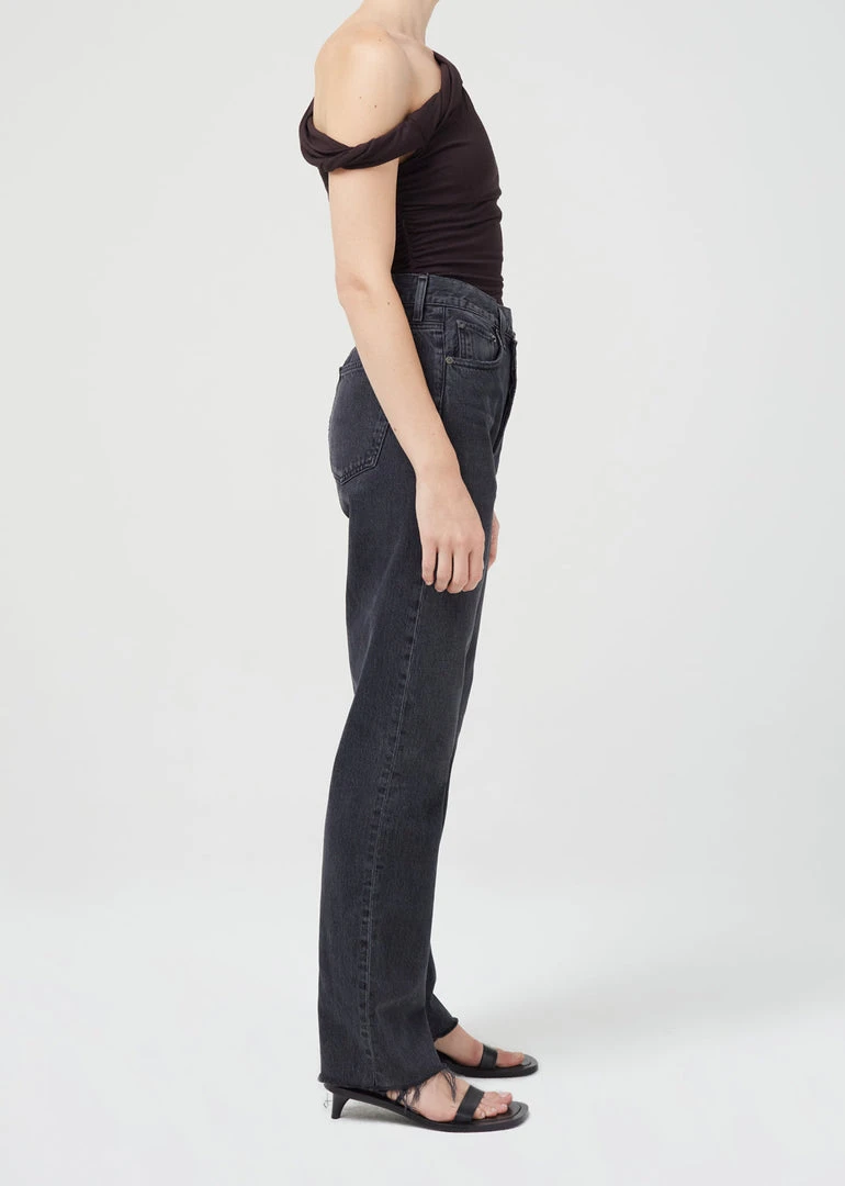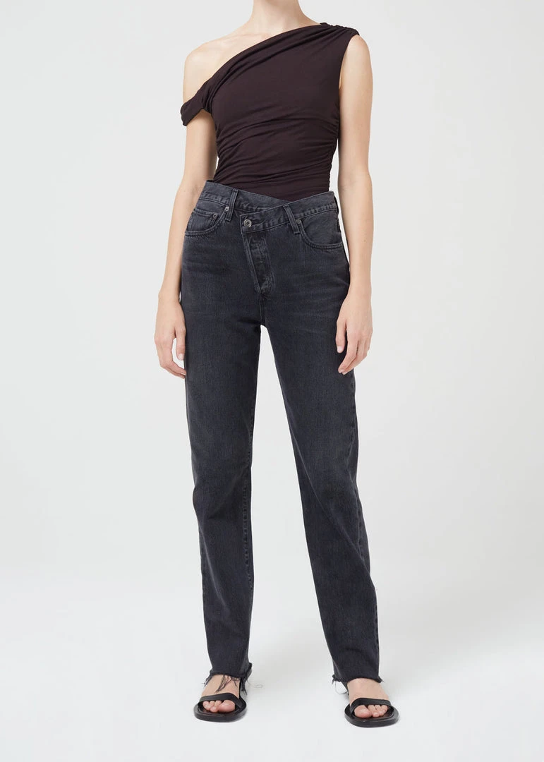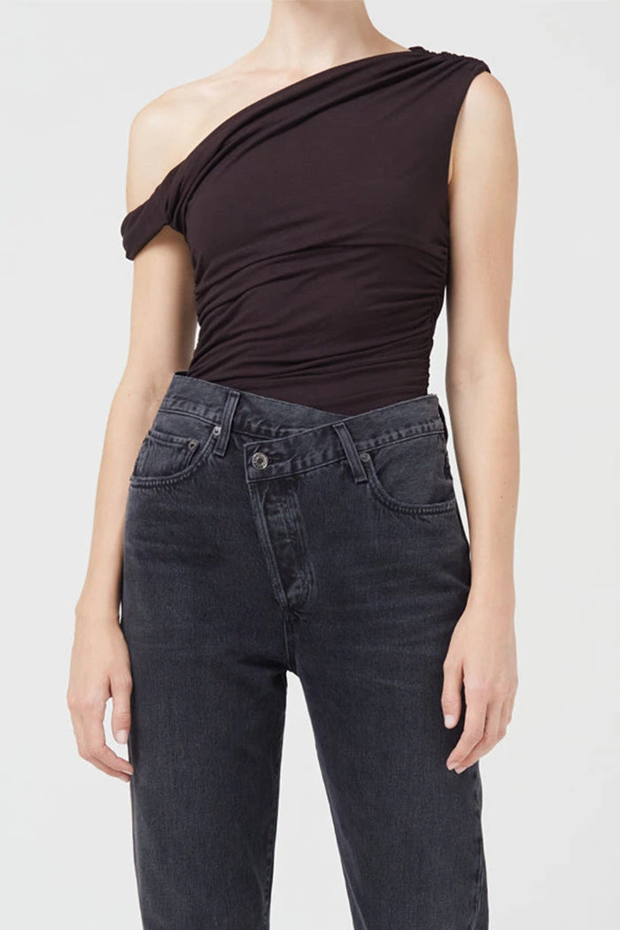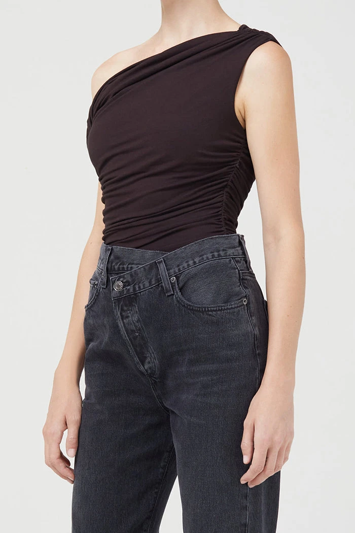 Agolde Hilma twist sleeve ruched bodysuit in brownie dark chocolate brown. Simple yet striking, this shoulder baring tank is crafted from our softest fabric, with the perfect hint of stretch. Tuck yours into denim to complete the look.