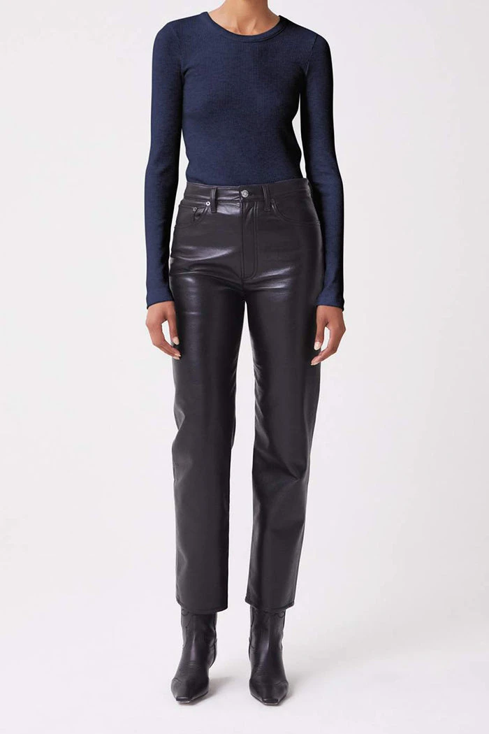 Agolde Maya organic long sleeve rib tee in navy blue india ink. Crafted from a ultra-soft thick heathered rib, the Maya Long sleeve is cut with a scoop neckline and fit that flatteringly hugs your frame.