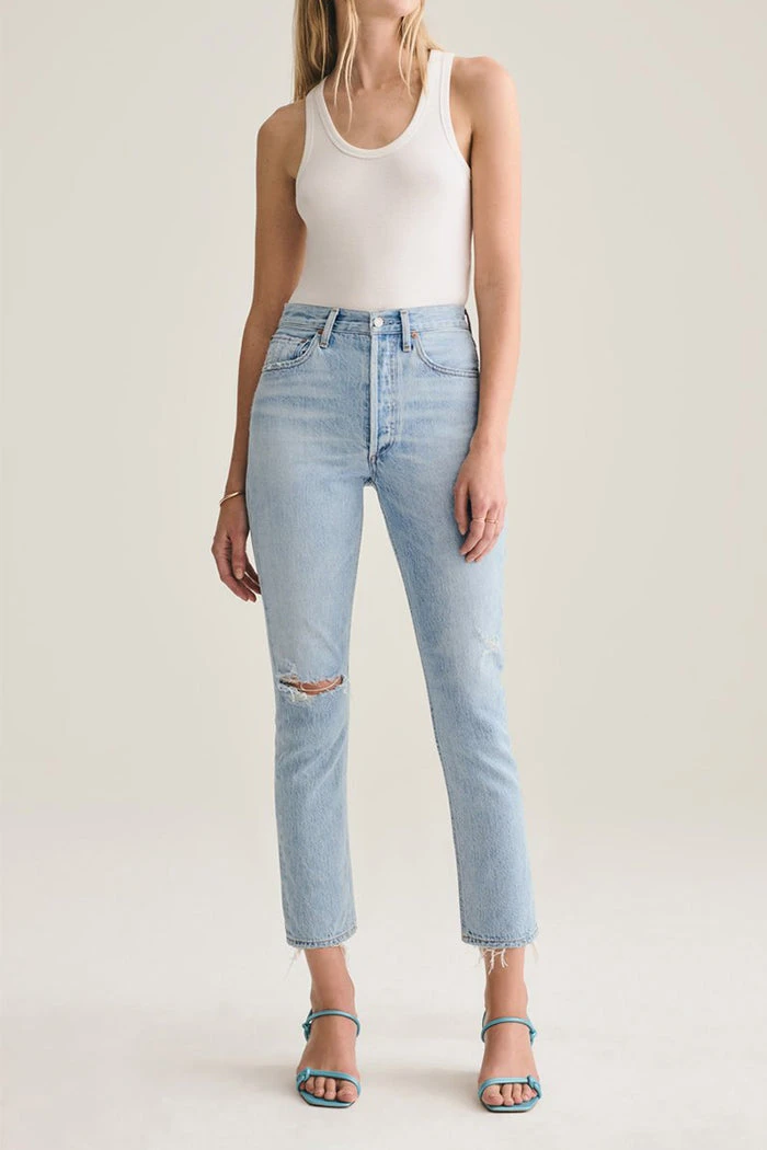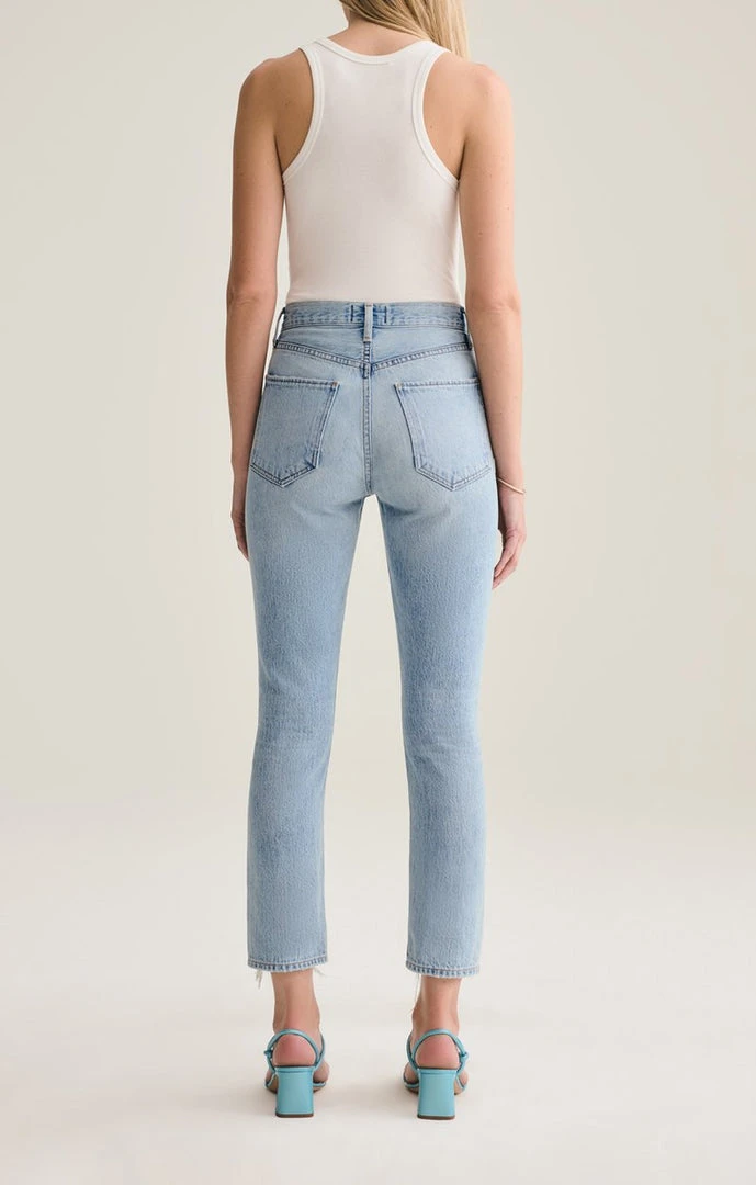 Riley hi rise crop straight leg in Shattered by Agolde. A light blue vintage wash with slight distressing and finished but frayed hem. The perfect hi rise. Button fly closure.