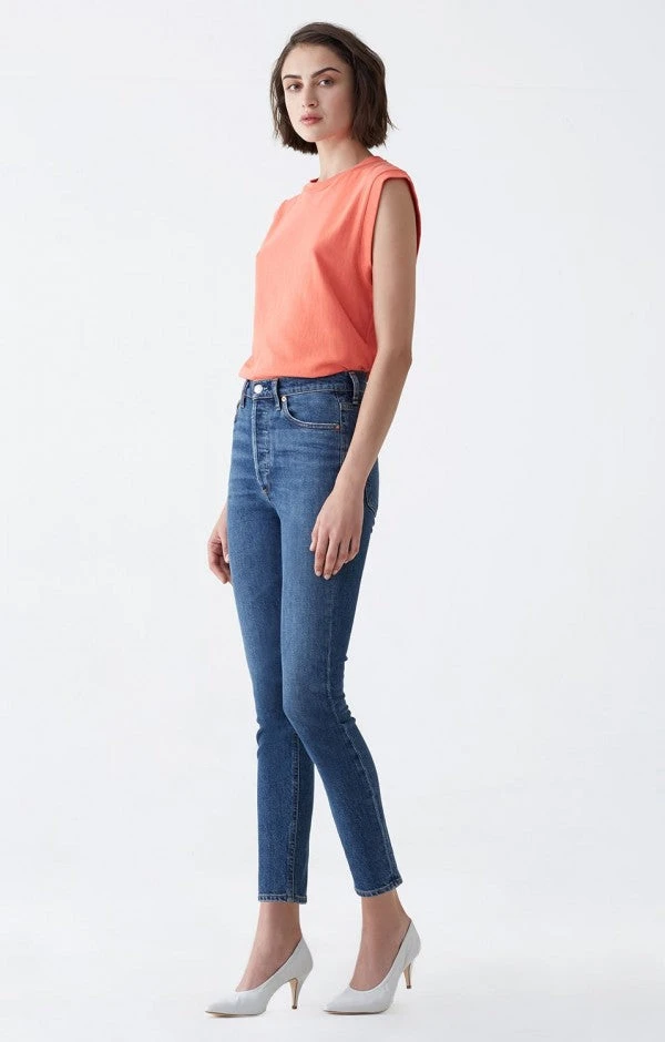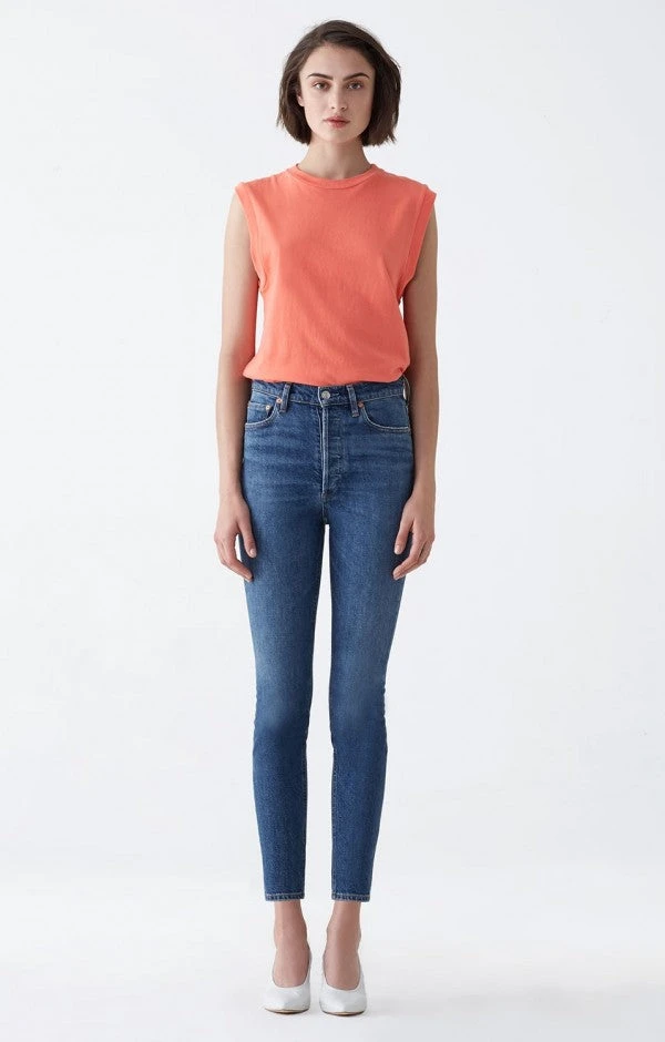 Agolde Nico hi-rise, slim, Subued wash denim. A classic medium blue indigo in comfort stretch denim. Comfort Stretch. Authentic vintage look with slight stretch for ease.