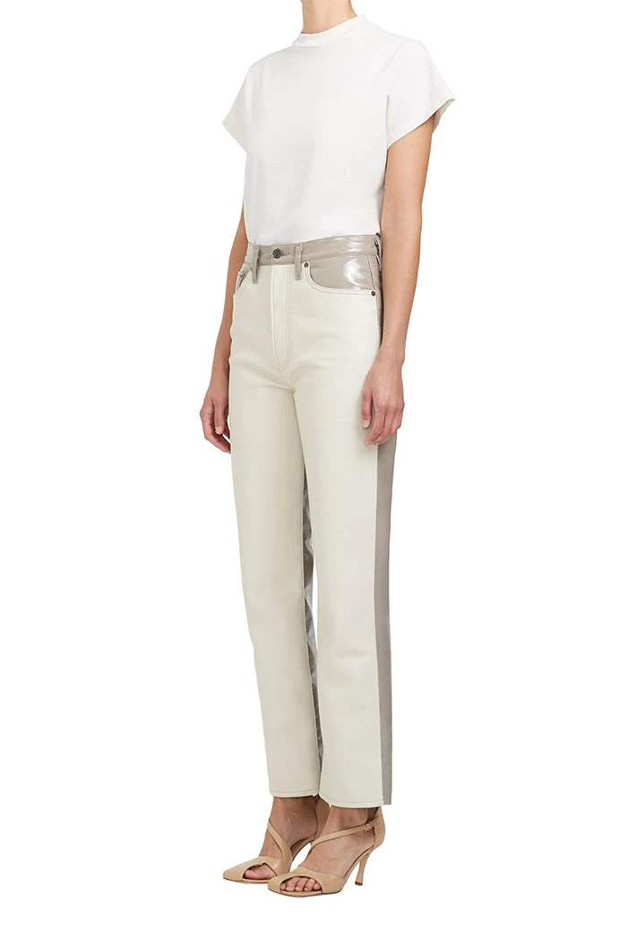 Agolde Paneled 90’s pinch waist recycled leather pants in powder cream and quail patent tan.