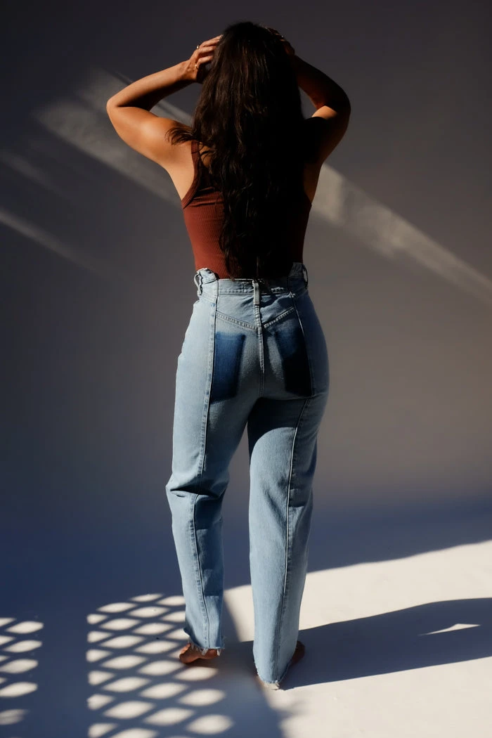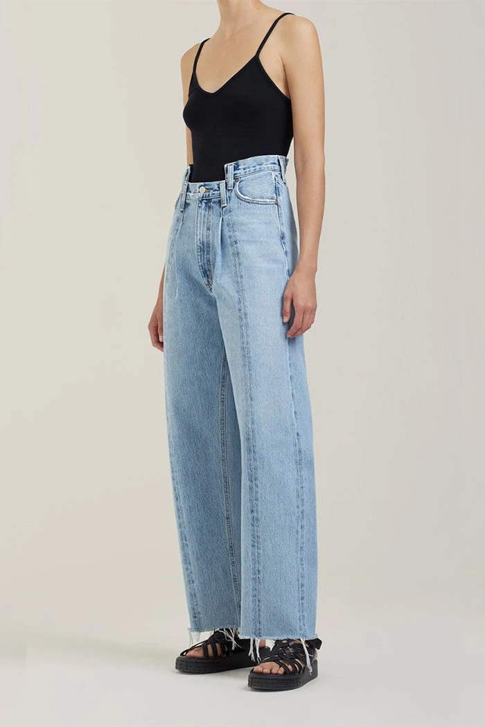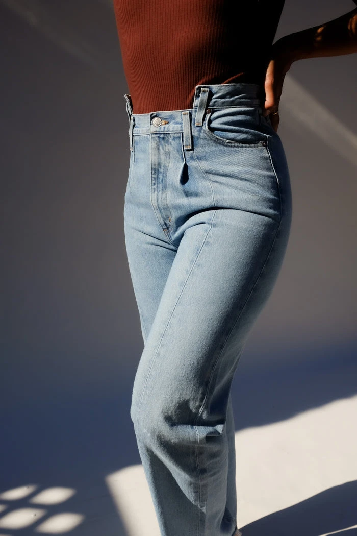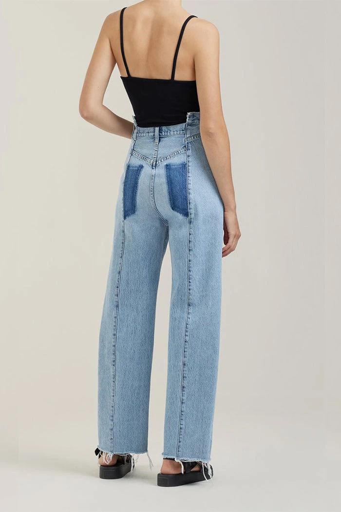 Agolde pieced angle jean in matrix blue. High rise relaxed straight features a stepped waistband and cut-off hem. Meticulously crafted and pieced together to create the perfect vintage-inspired pair. Button fly.