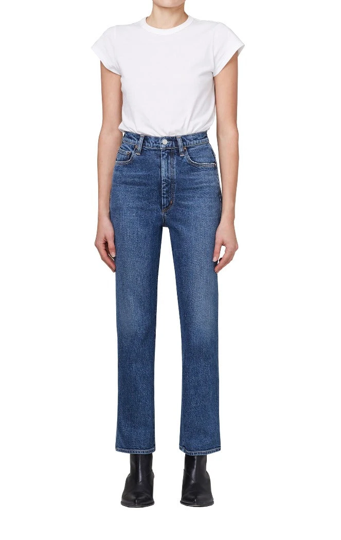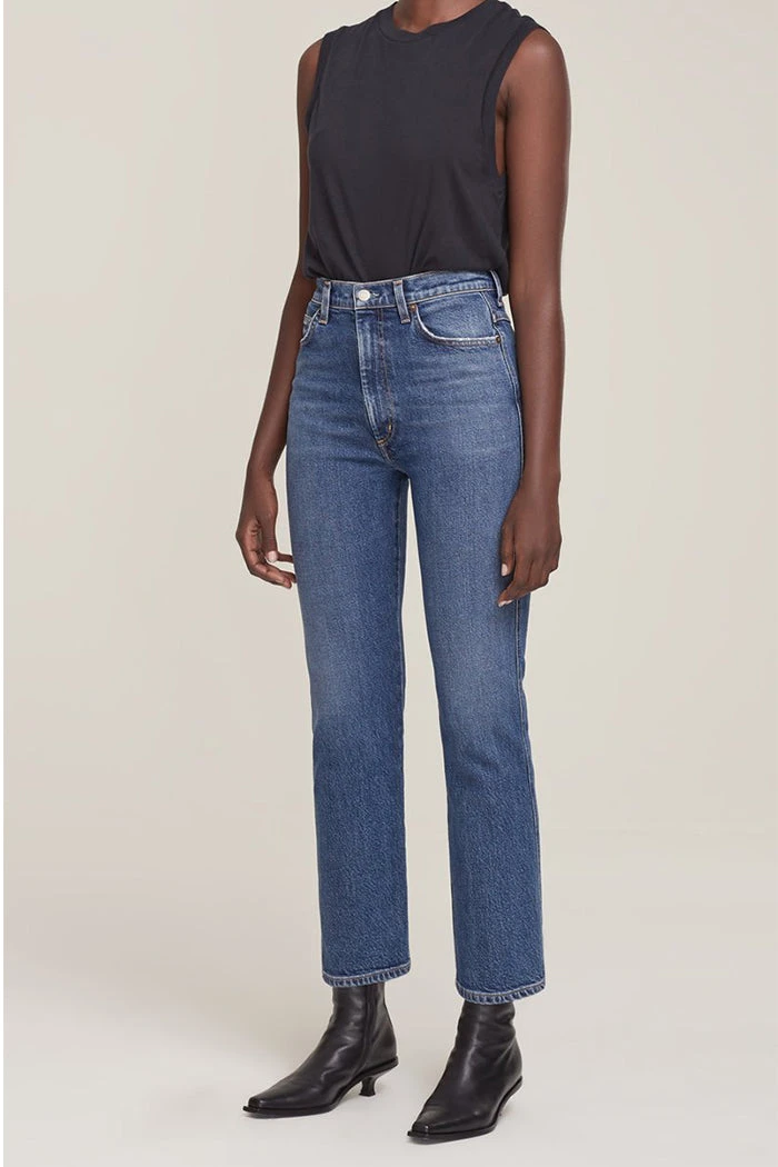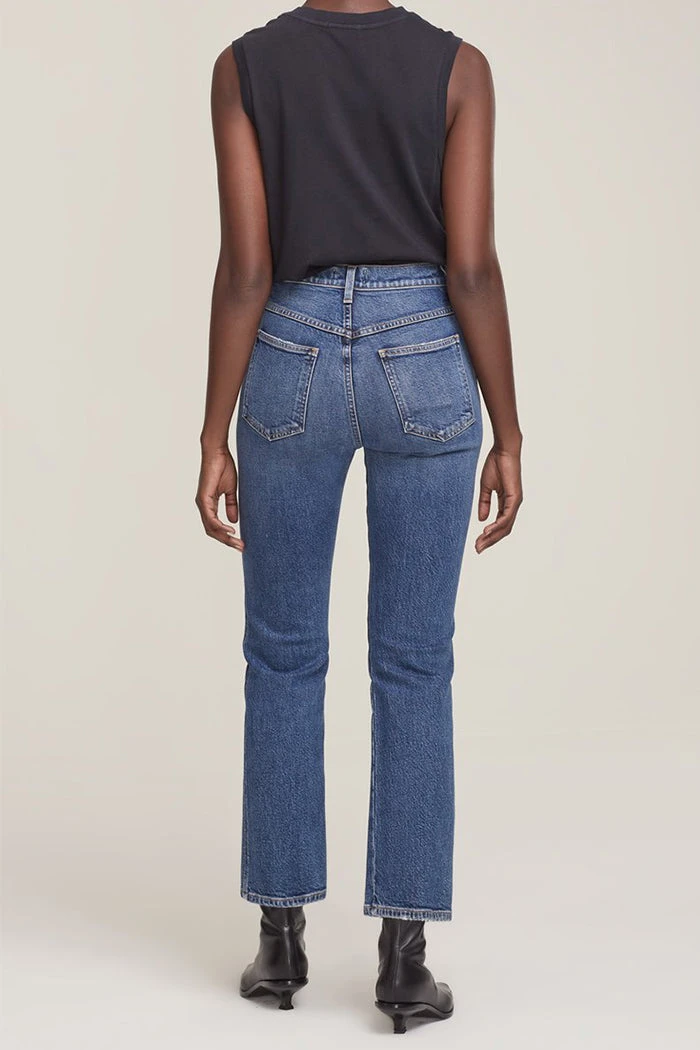 Agolde pinch high rise kick in medium indigo Sound wash, with subtle fading and whiskering. Aptly named, this 80s-inspired silhouette is designed to flatter your frame with a neatly cinched waistband. The crowd favorite features a higher-than-high rise, slim fit through the thighs and cropped flared hems. Crafted from stretch denim in a wear-everyday medium indigo wash. Ultra high rise slight kick flare. Zip fly closure.