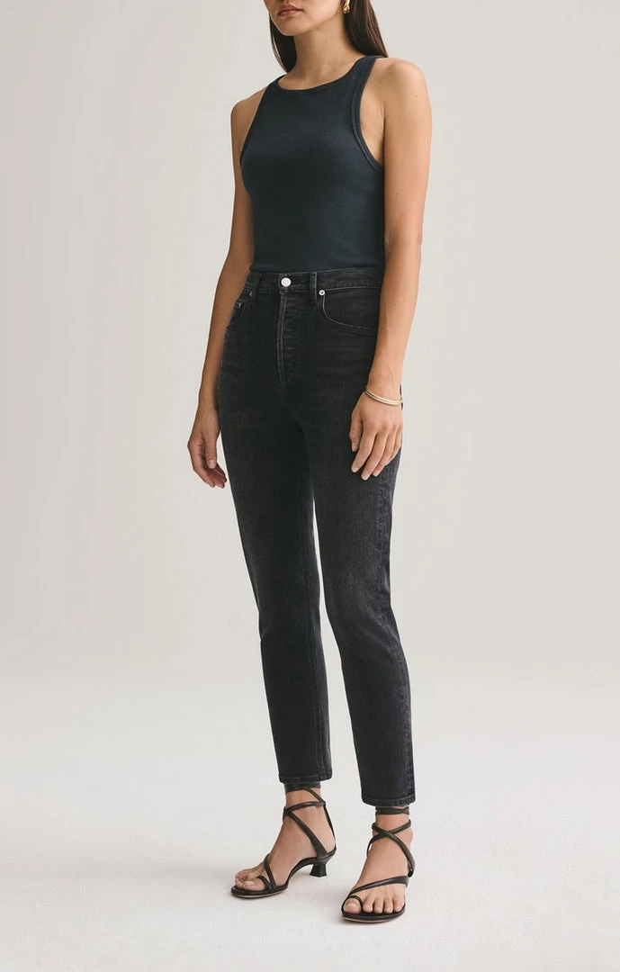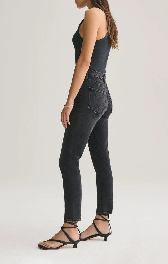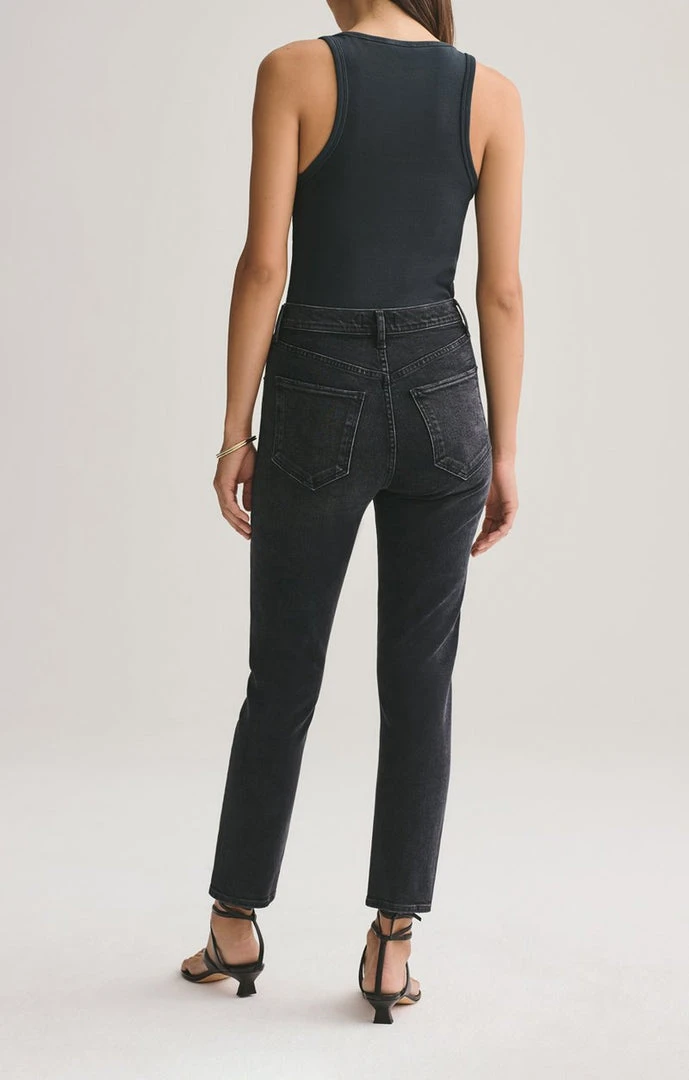 Agolde Riley in washed black denim black pepper. High rise, slim straight leg, sits close to the body with a cropped inseam. Comfort stretch. Button fly closure.