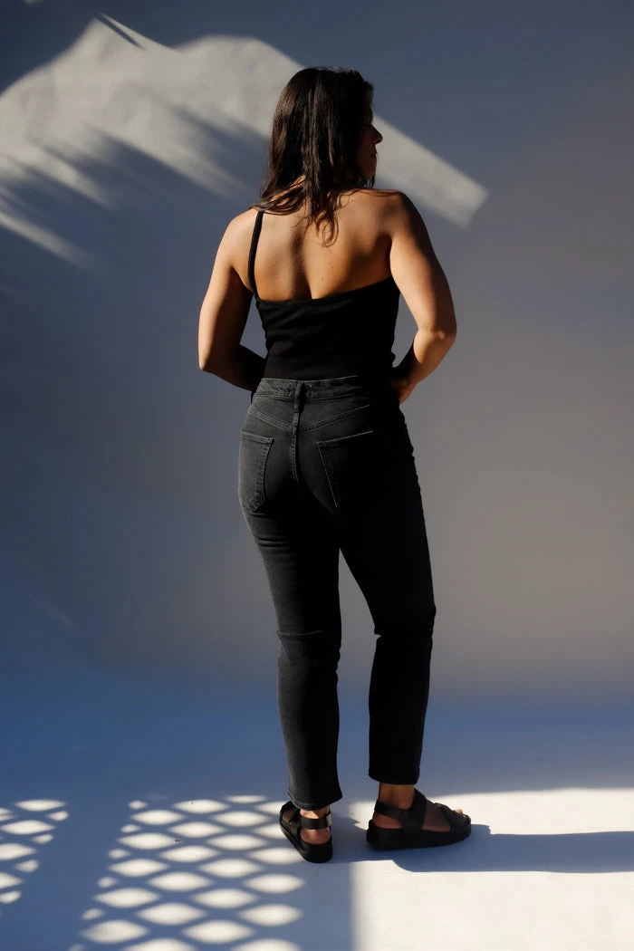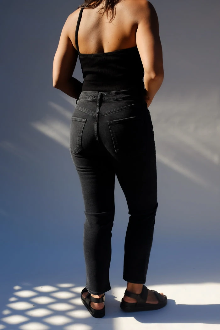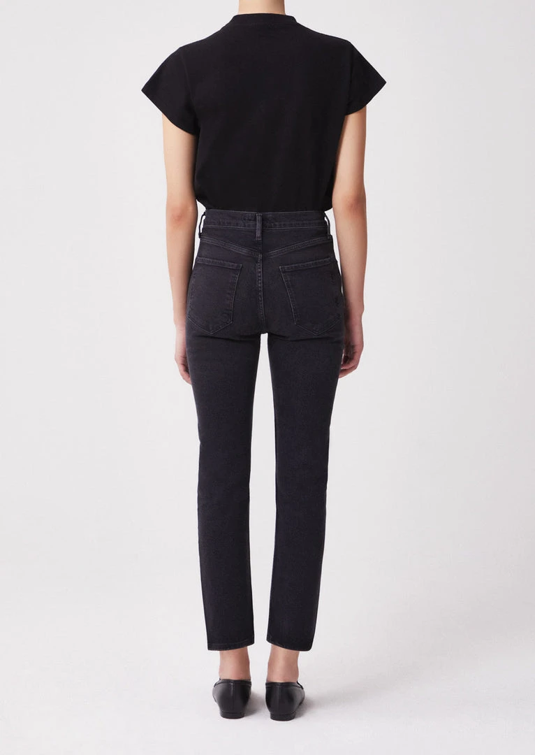 Agolde Riley high waist, comfort stretch washed black Panoramic straight leg jeans. High rise, slim straight leg, sits close to the body with a cropped inseam. Comfort stretch. Button fly closure.