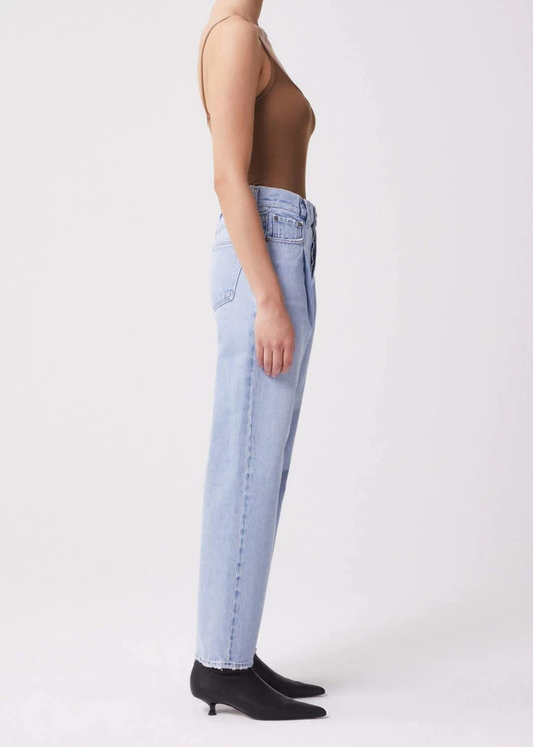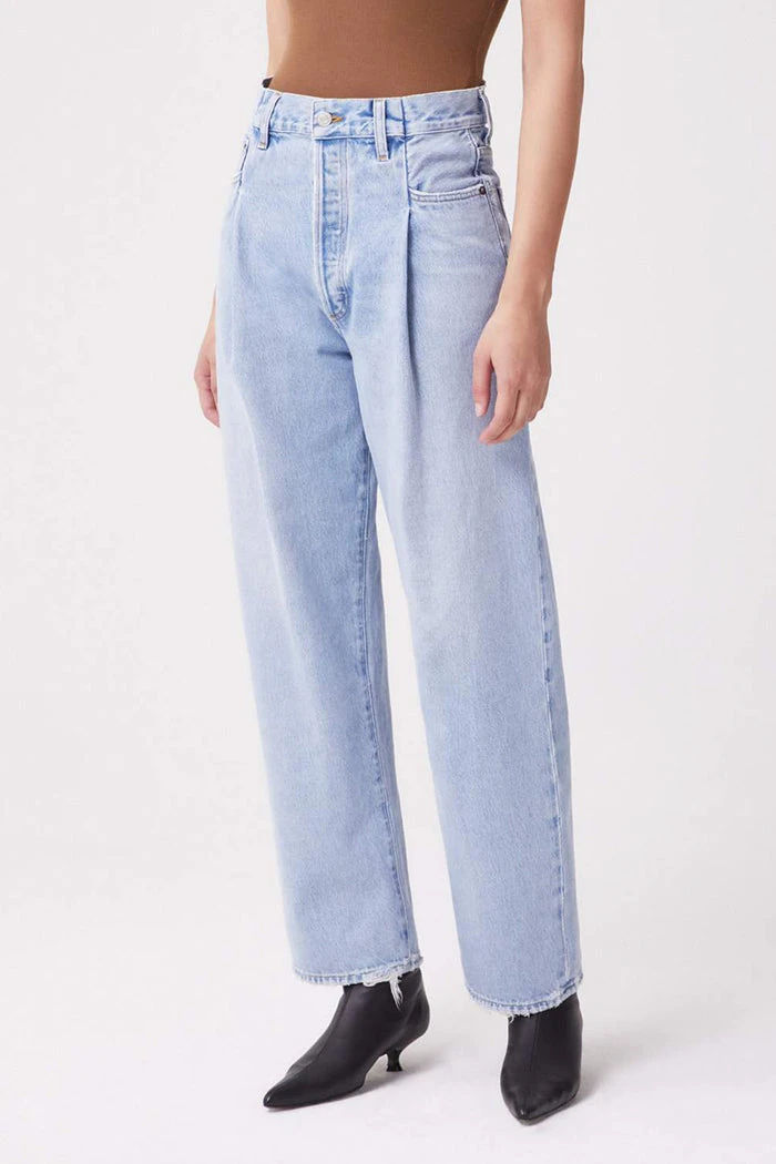 Agolde Folded Waistband straight leg jeans in light blue sideline wash. Thoughtfully placed fold details add dimension to this relaxed, easy straight leg. Crafted with a reconstructed waist band, the high-rise pair styles well with a tucked in tee or tank. Zip fly.