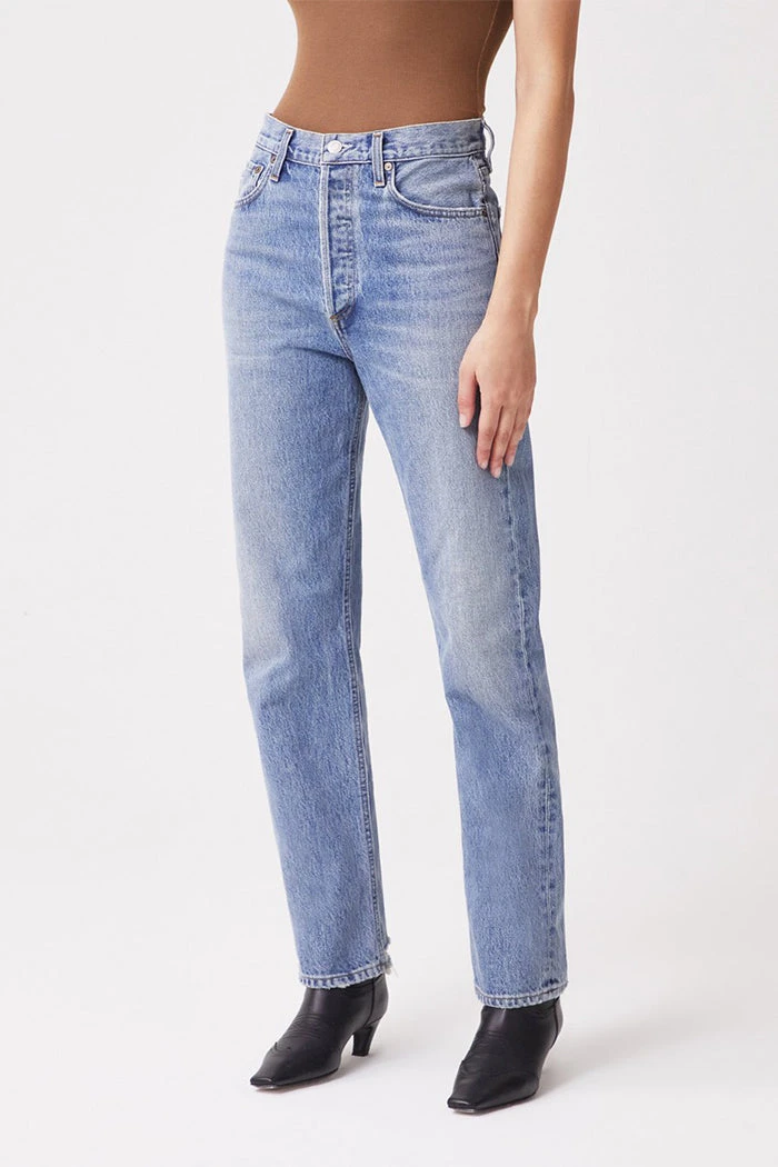 Agolde 90’s pinch waist, high rise in medium blue wash Endless. This is an update to the best selling 90’s jean, but meant to fit more high rise and fitted through the waist. Distressing on back of hem.