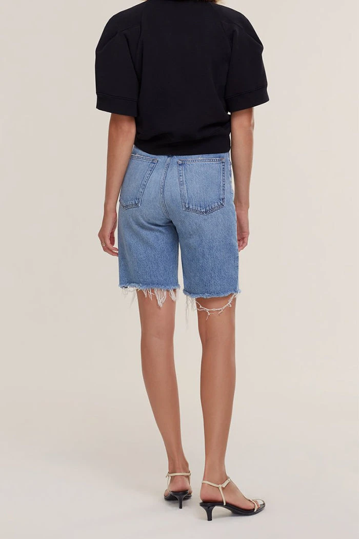 Agolde 90’s pinch waist shorts in medium marbled indigo wash marquee. If you love the Pinch Waist Jean, you’ll be living in these shorts. Sitting high with a super-cinched waist, this ultra-flattering style features a straight fit through the thigh with vintage-inspired cut-off hems. Non-stretch denim with an authentic look and soft-to-the-touch feel. Button Fly.