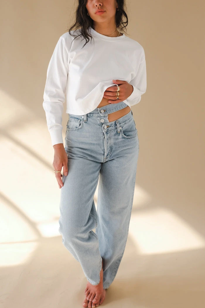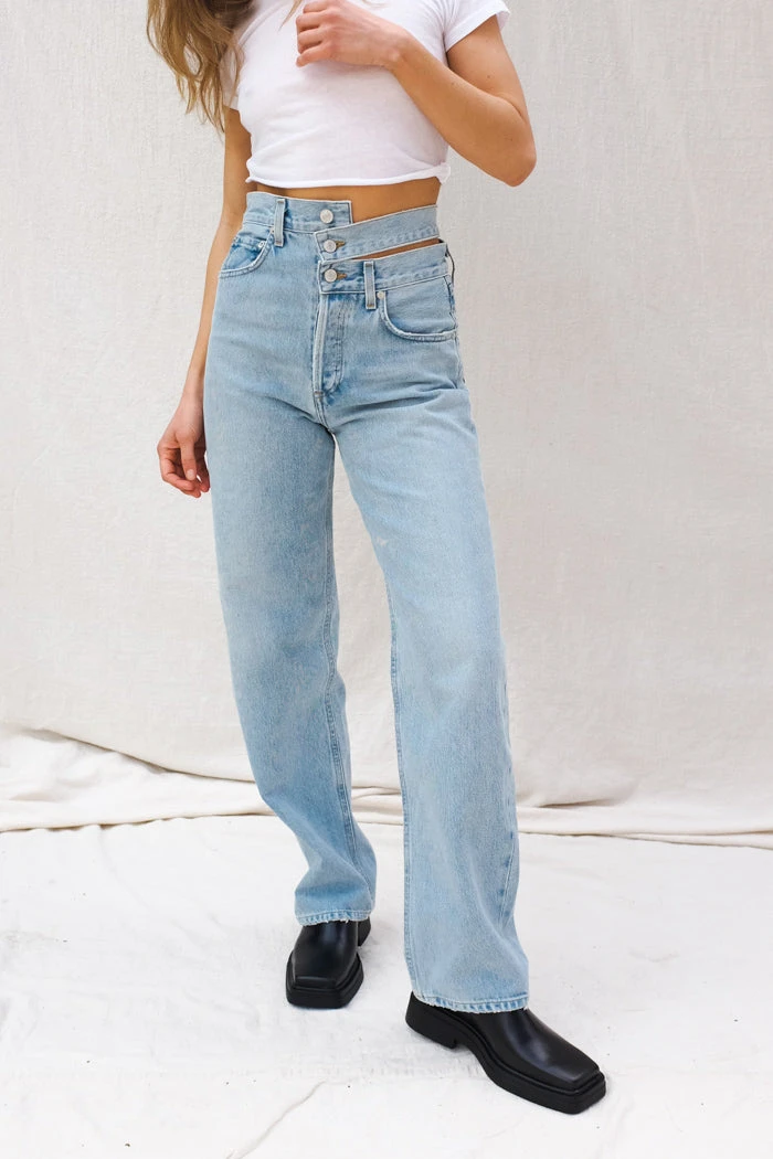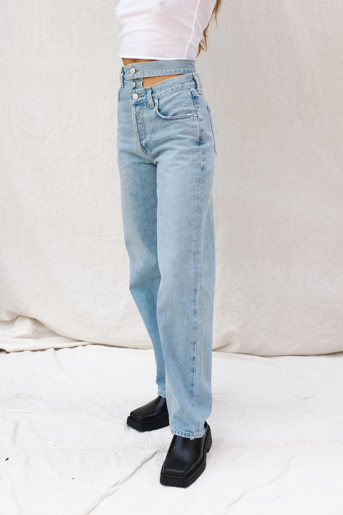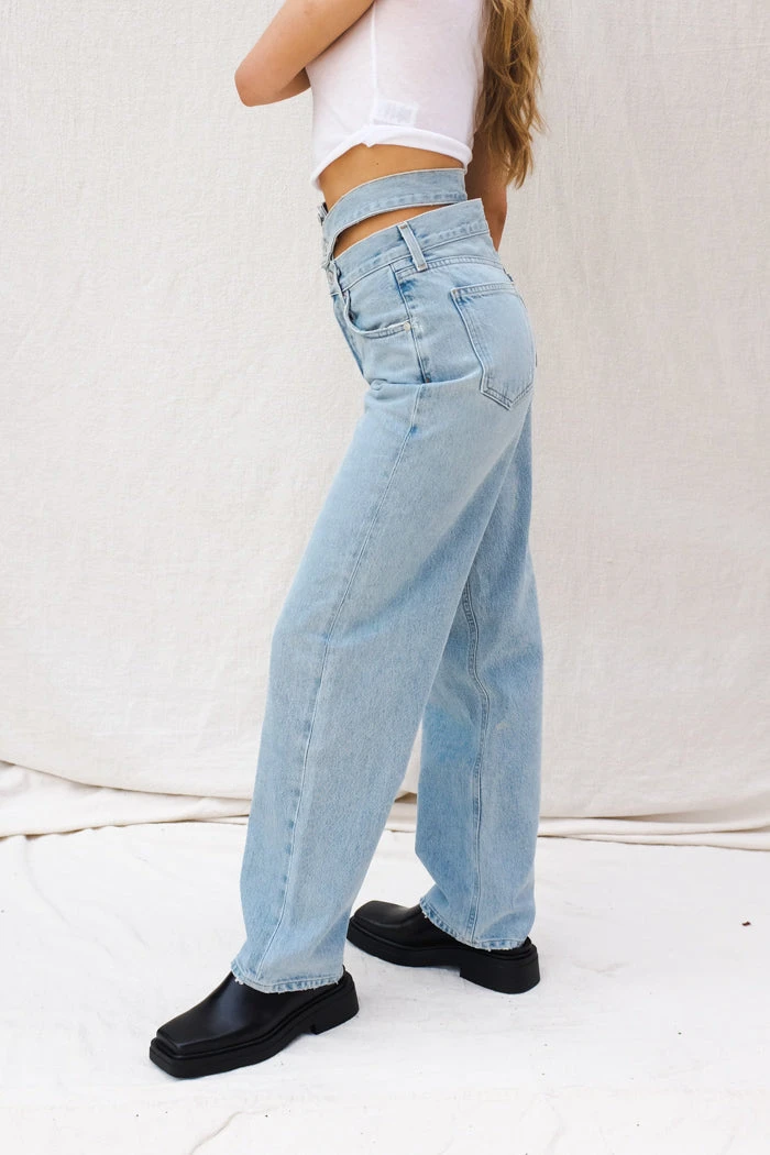 Agolde broken waistband jean in pale clean indigo sideline wash. An easy, slightly relaxed straight fit with a broken waistband detail to show a sudden flash of skin. Super soft non-stretch organic denim with a slight drape. Button fly.