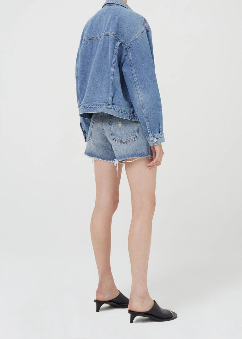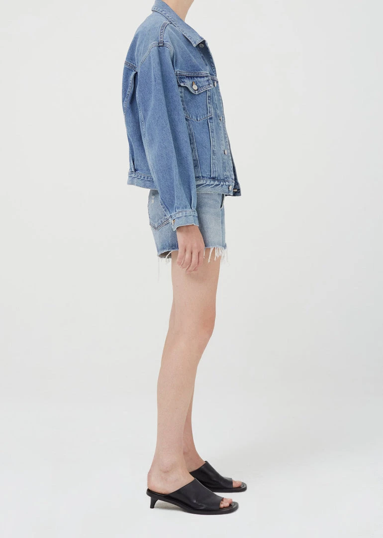Agolde Charli oversized denim jacket in medium vintage debate wash. The dropped shoulder and slouchy silhouette give this fit a super relaxed feel. Made from non-stretch denim in a vintage-inspired indigo.