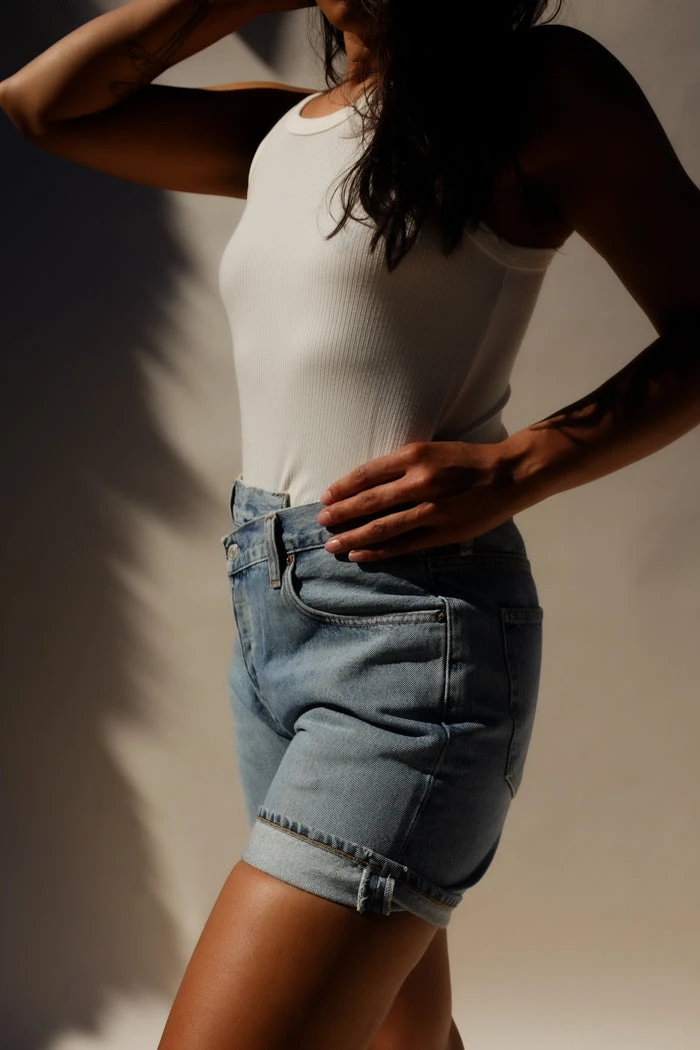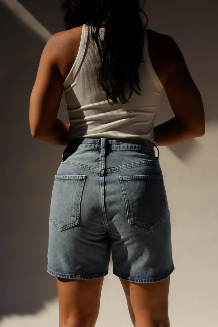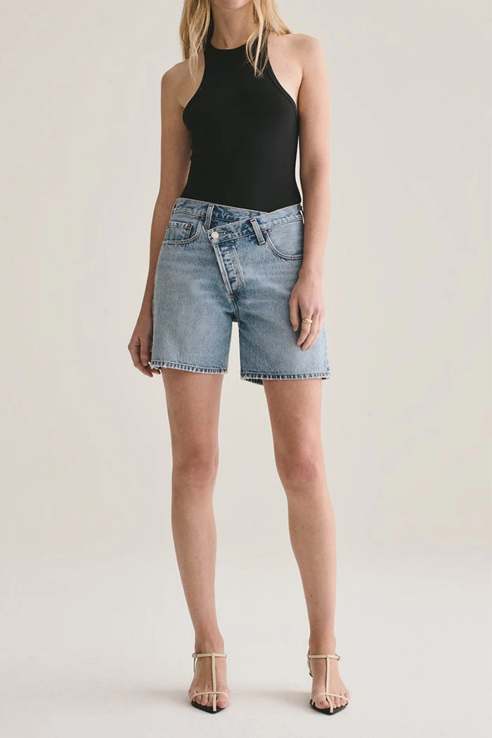 Agolde criss cross boyfriend fit denim shorts, in light vintage blue momentum wash. Cut with an easy leg and clean finished hem. Can be styled rolled. Non stretch, button fly closure.