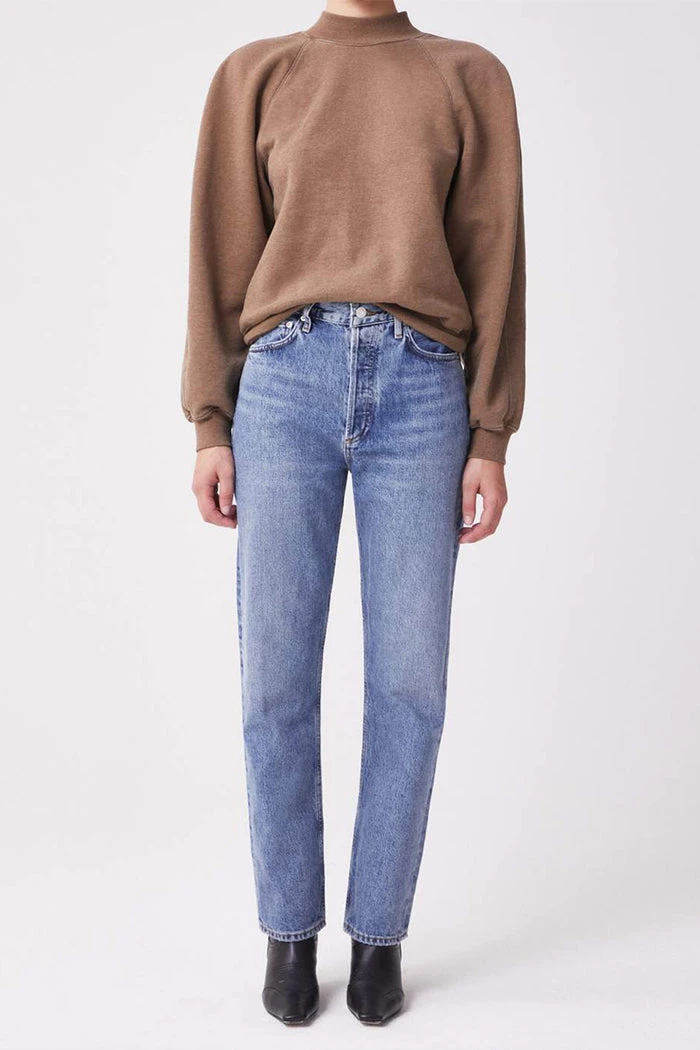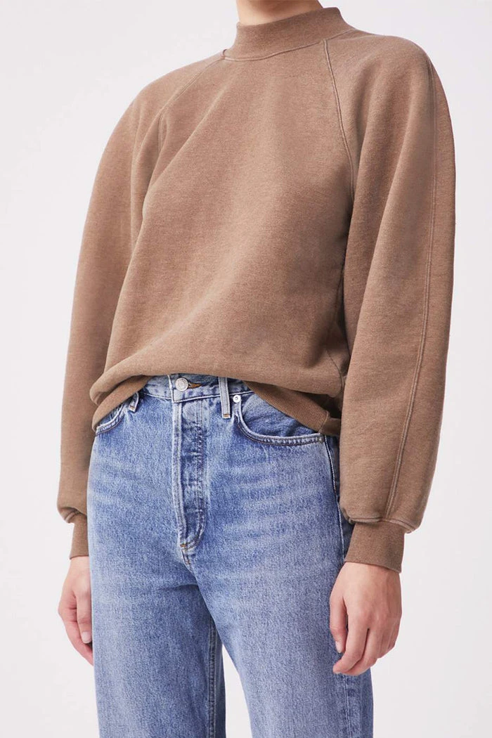 Agolde Tarron mock neck sweatshirt in toffee heather brown. The high neckline and roomy sleeves add controlled volume to this comfortable classic.