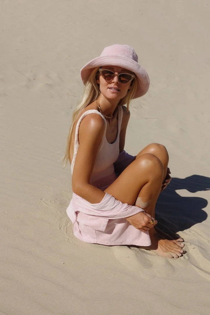 Araminta James terry bucket hat in dusty rose. Soft 100% cotton terry toweling fabric, will keep face and décolletage  protected all summer long.