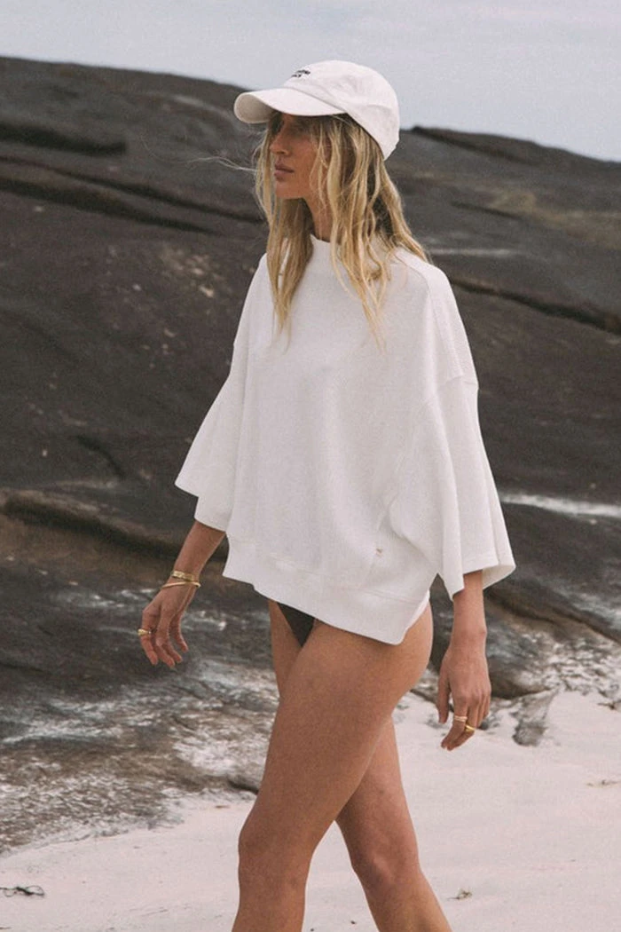 Araminta James Waffle turtleneck top in milk white. Featuring ribbed neck detail and drop shoulders, falling to a flattering self waistband. The ribbed waffle fabric will keep in shape, even after lots of washing.