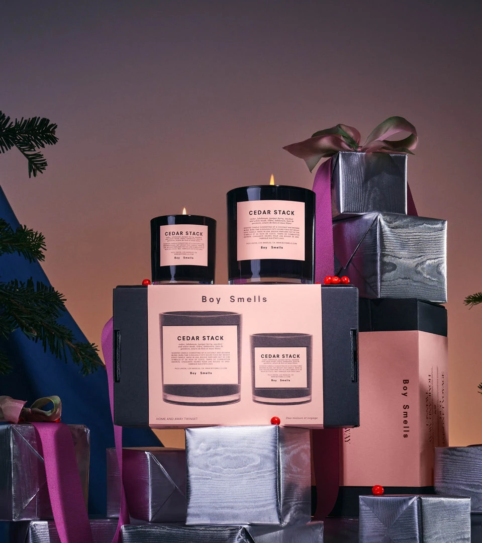 Coconut and beeswax blend with braided cotton wicks, in glossy black glass tumblers. Candles come in matte black tray in clamshell box with embossed matte pink sleeve.