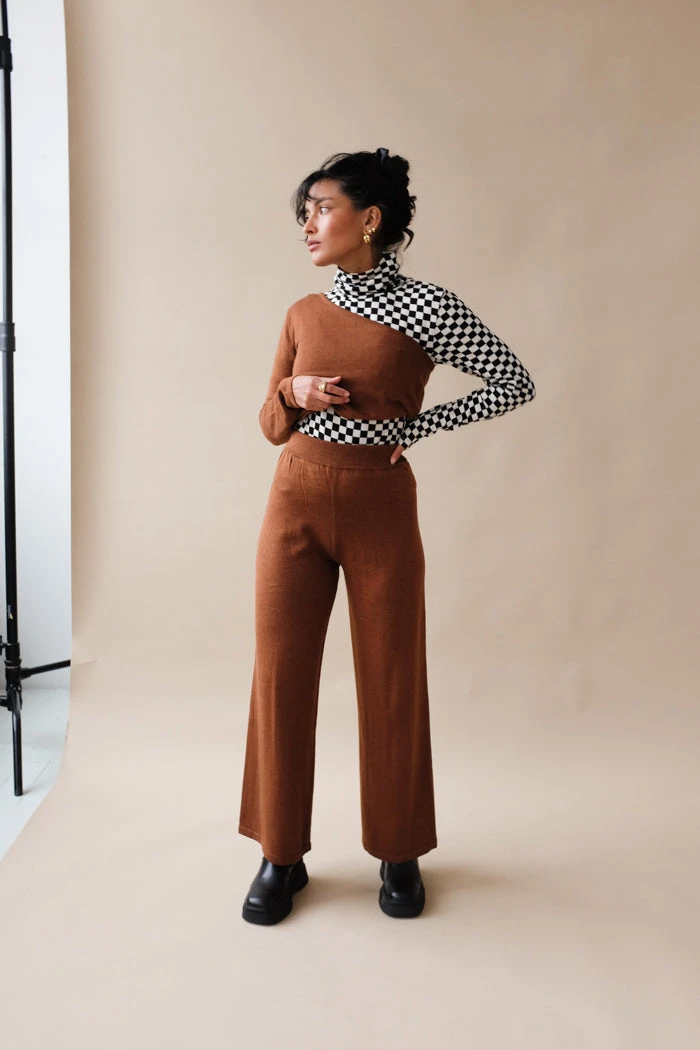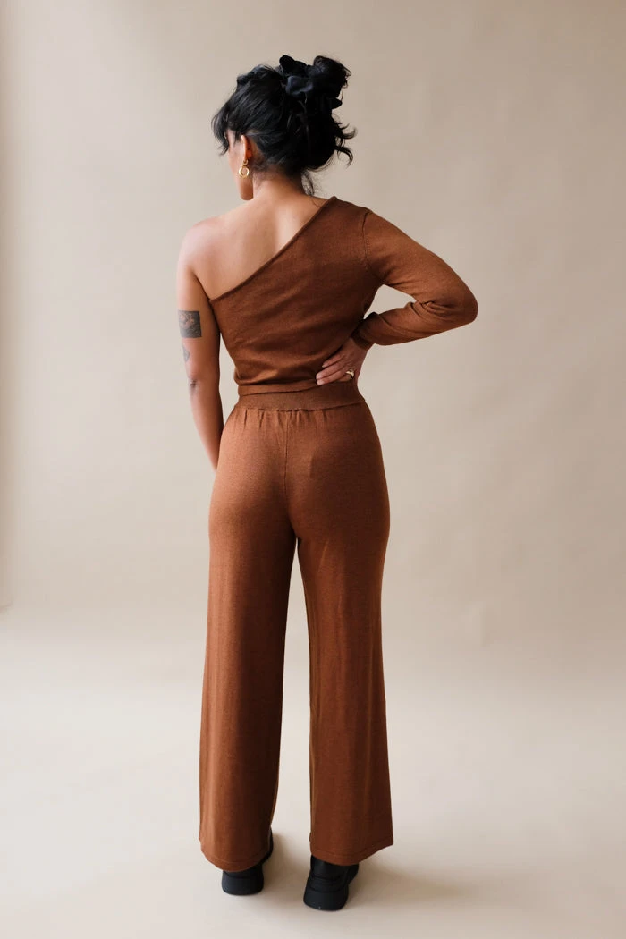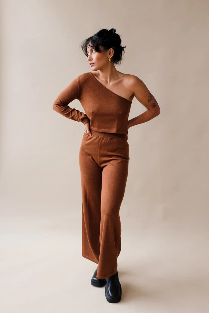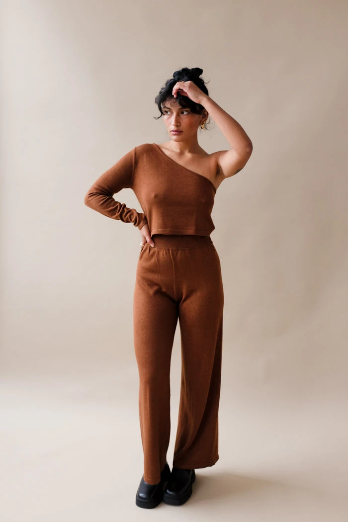Callahan Lora long sleeve, knit, asymmetric top in root beer brown.