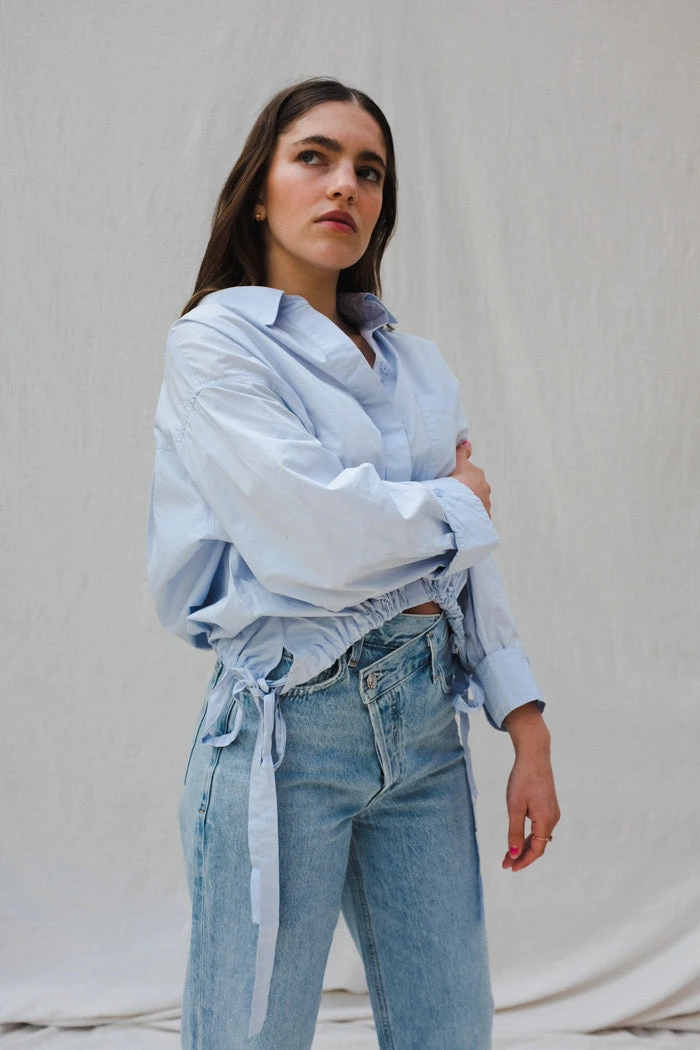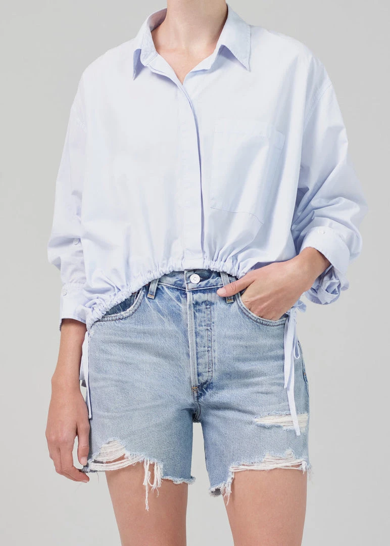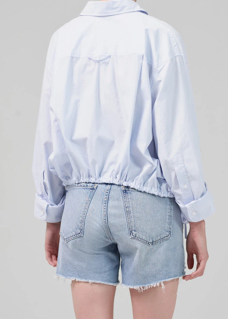 Citizens of Humanity Alexandra collared poplin button up shirt, with cinched drawstring tie hem in cruz blue. Relaxed, cropped fit. Single front patch pocket.