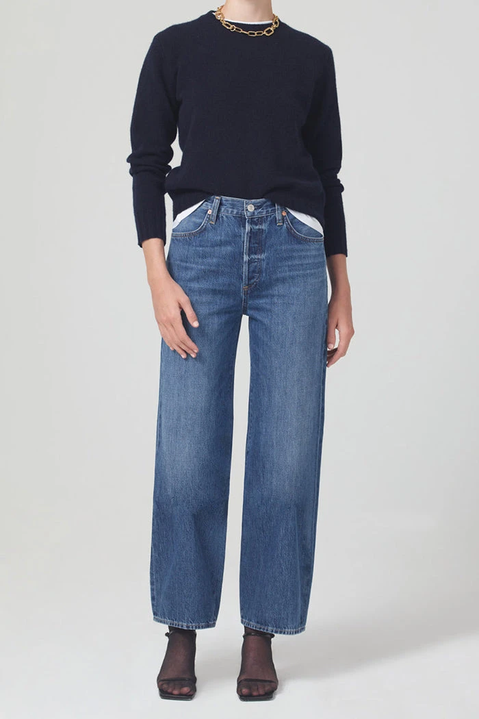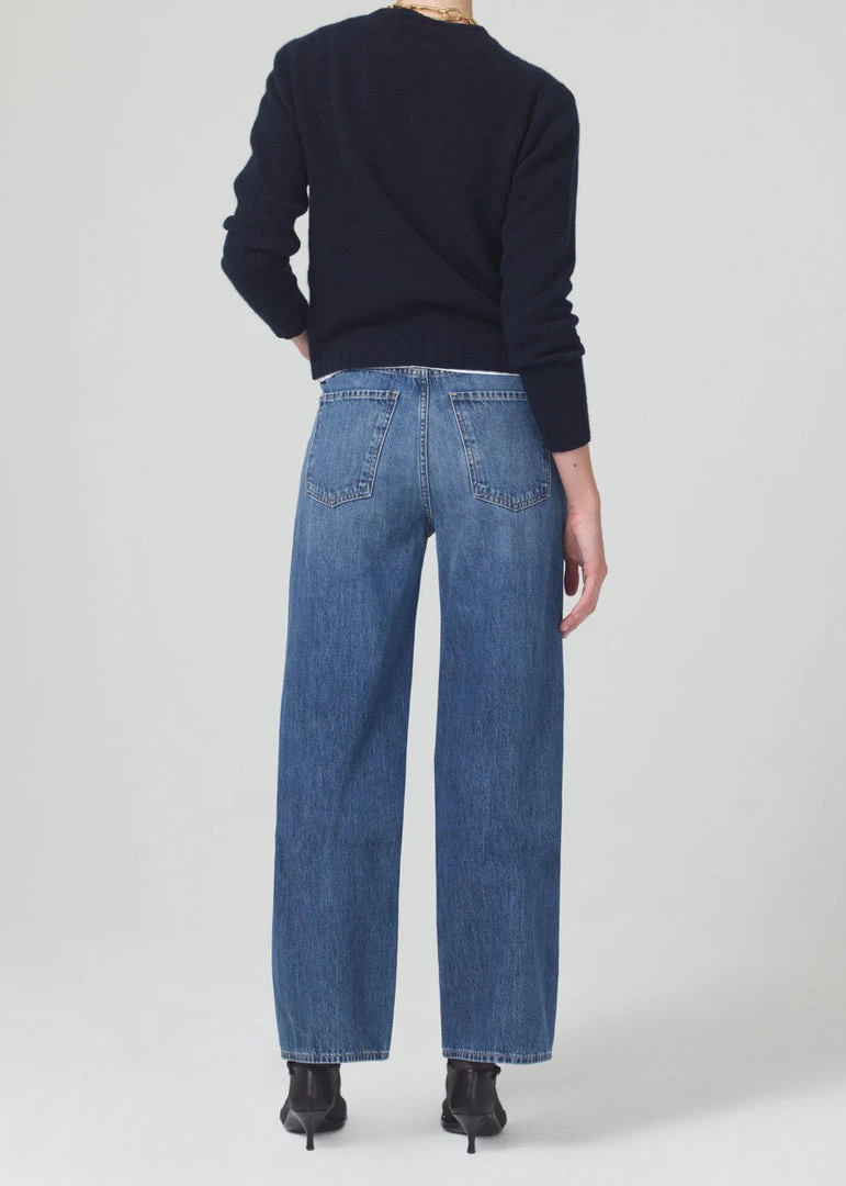 Citizens of Hummanity Flavie trouser style jean in medium blue Pinnacle wash. These jeans sit high on the waist with a flattering, ultra-relaxed wide-leg. Button fly.