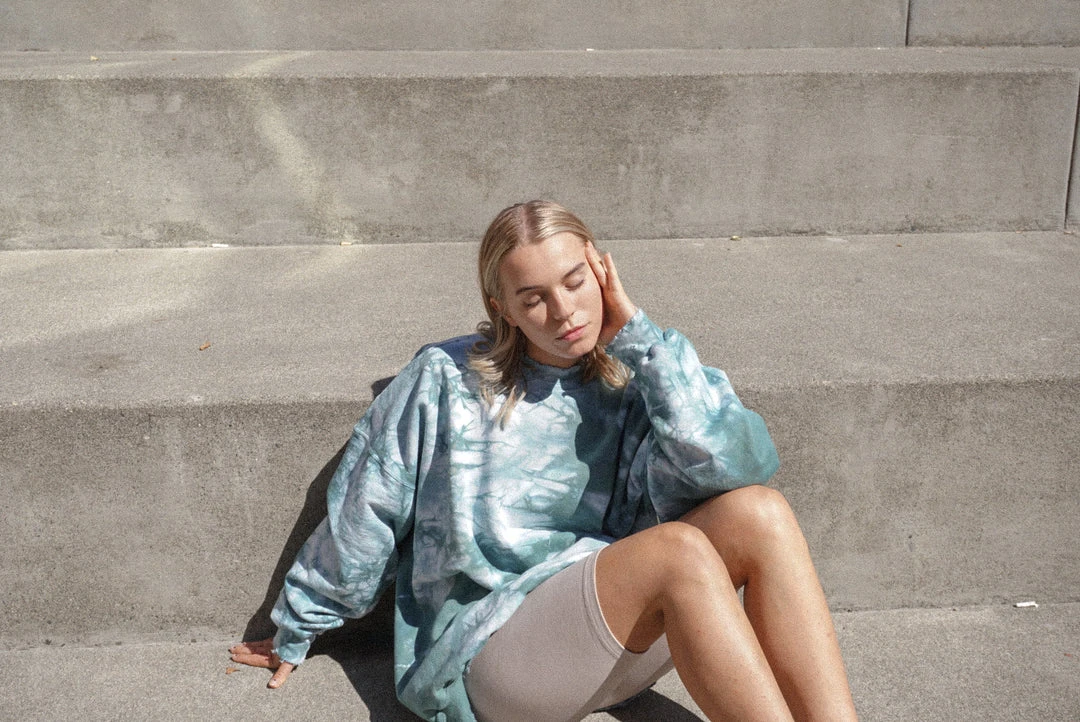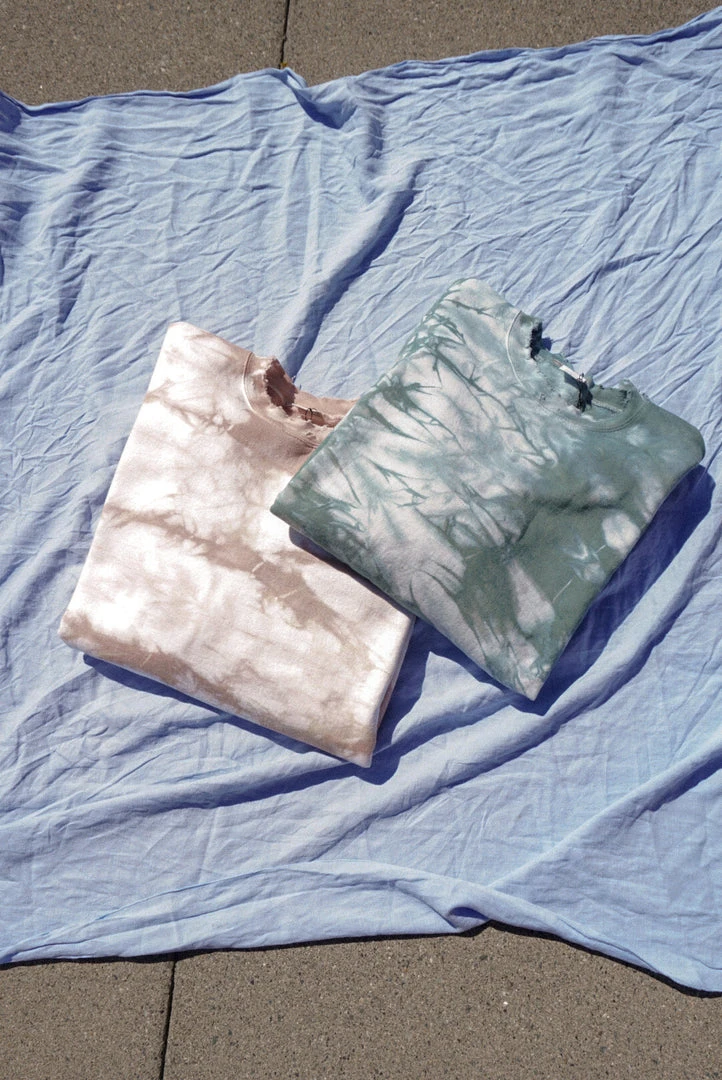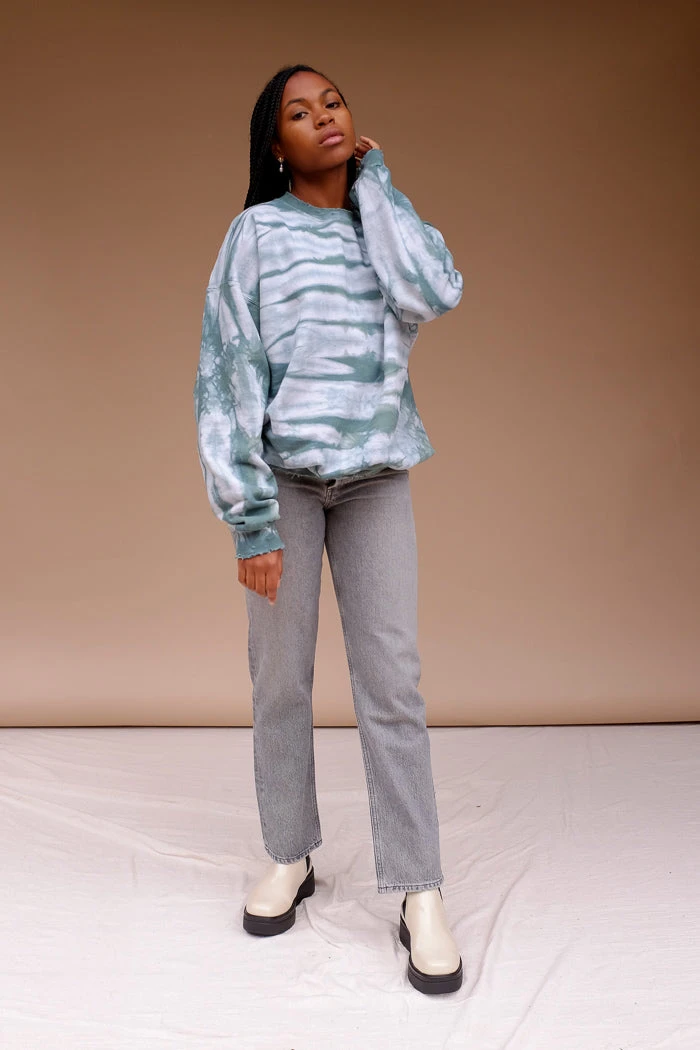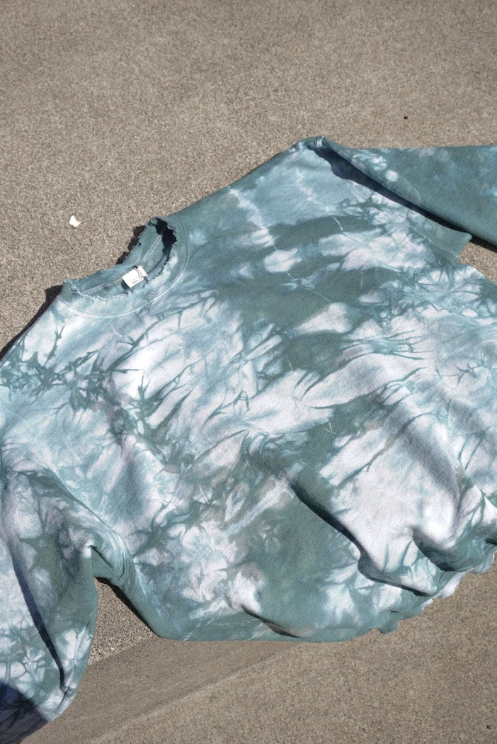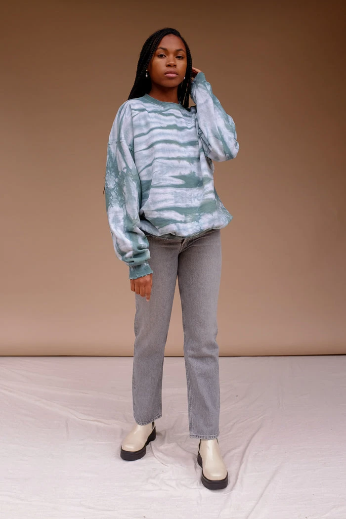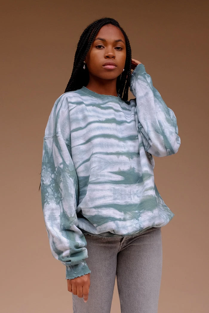 Eclectic Sun locally hand dyed and distressed exclusively for P&R the pines forest green oversized crewneck sweatshirt in green tie dye wash.