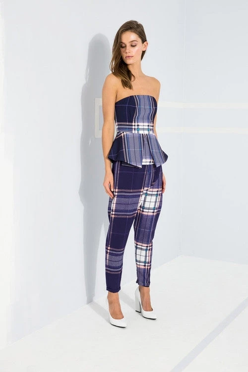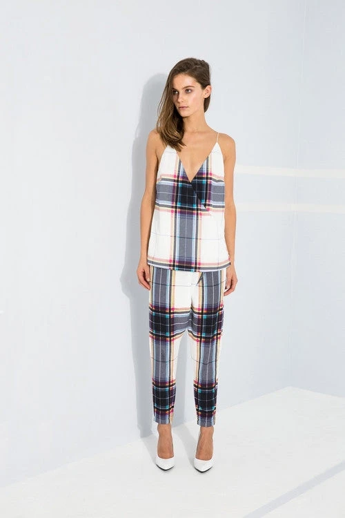 A relaxed drop crotch style pant with a tapered leg, asymmetrical overlap, and a thin waistband featuring Finder’s Keepers Navy Tartan print. Also available in white tartan plaid.