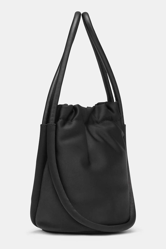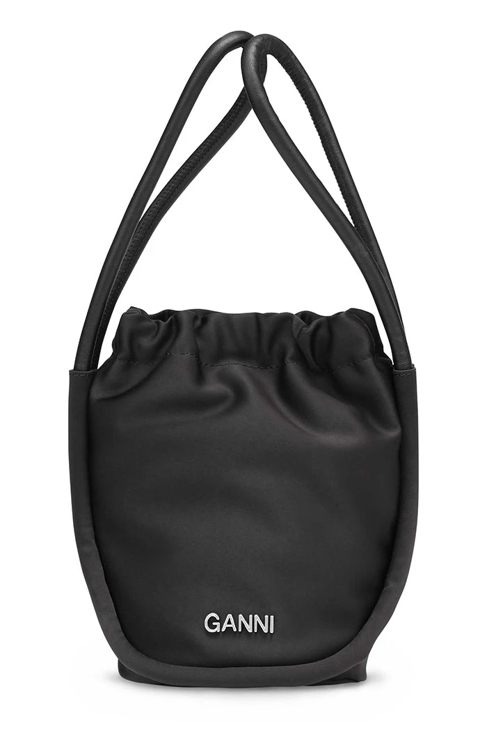 Ganni vertical side-strap mini bag in tech fabric, finished with a silver logo detail and elasticated open-top hem. Contrasting leather side straps are threaded through exposed tubes on each corner of the bag for a unique silhouette.
