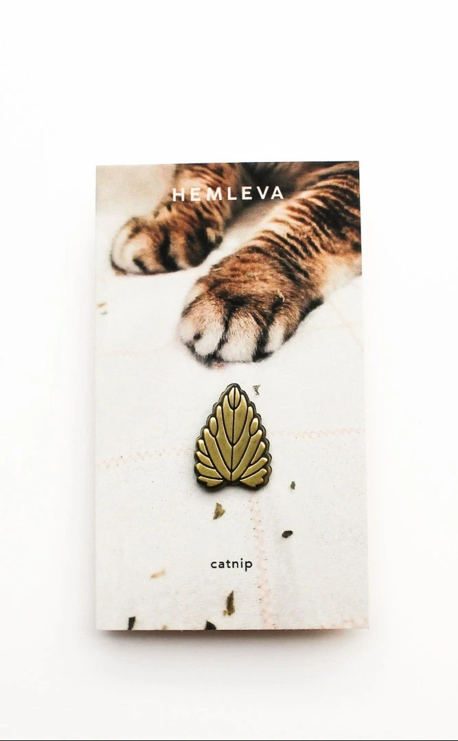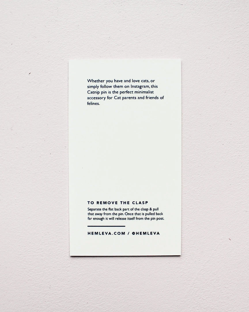 Hemleva Catnip plant gold pin. Whether you have and love cats, or simply follow them on Instagram, this Catnip pin is the perfect minimalist accessory for Cat parents and friends of felines.