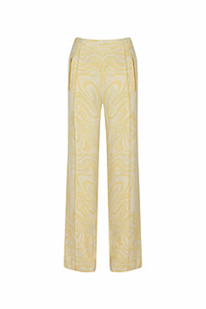 House of Sunny Bay tracksuit knit pants in yellow blonde with psychedelic marble print. High waisted, front seam, gold zipped pockets, and house of sunny embroidered logo under pocket.