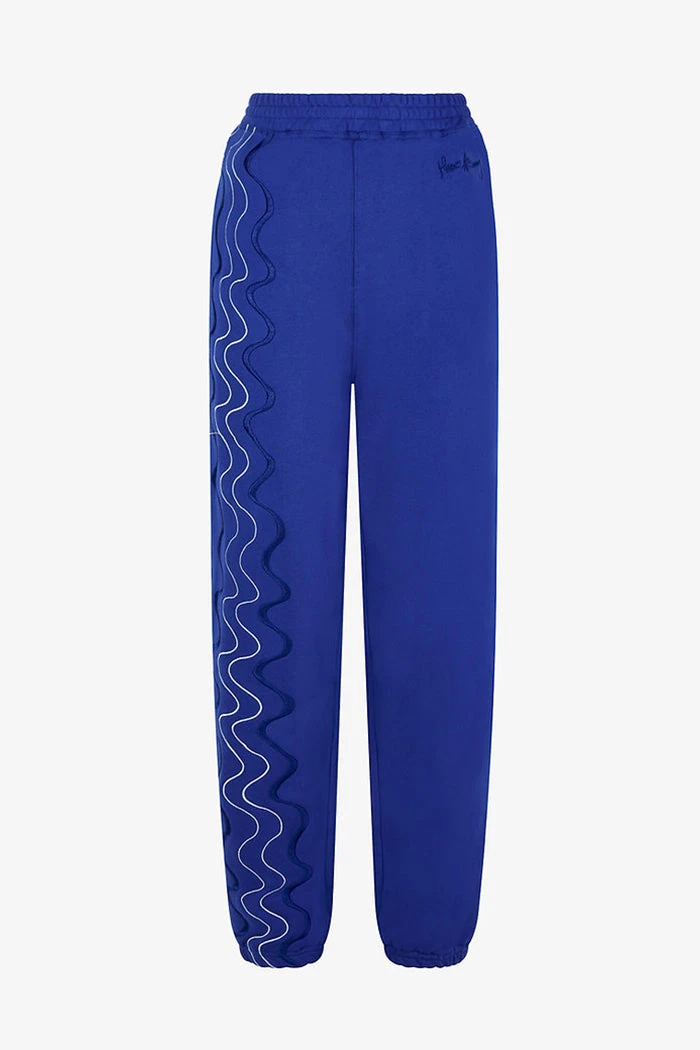 House of Sunny Make it Rain royal blue sweatpants with abstract wave embroidery. These sweats have an elasticated waistband and cuffed hem. A wavy, multicolour embroidery climbs up along the right leg, with a logo embroidery atop the left.