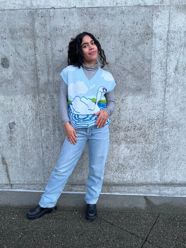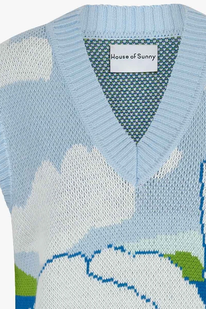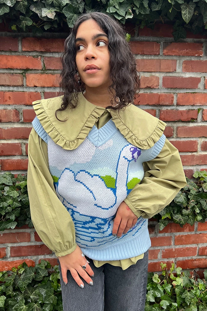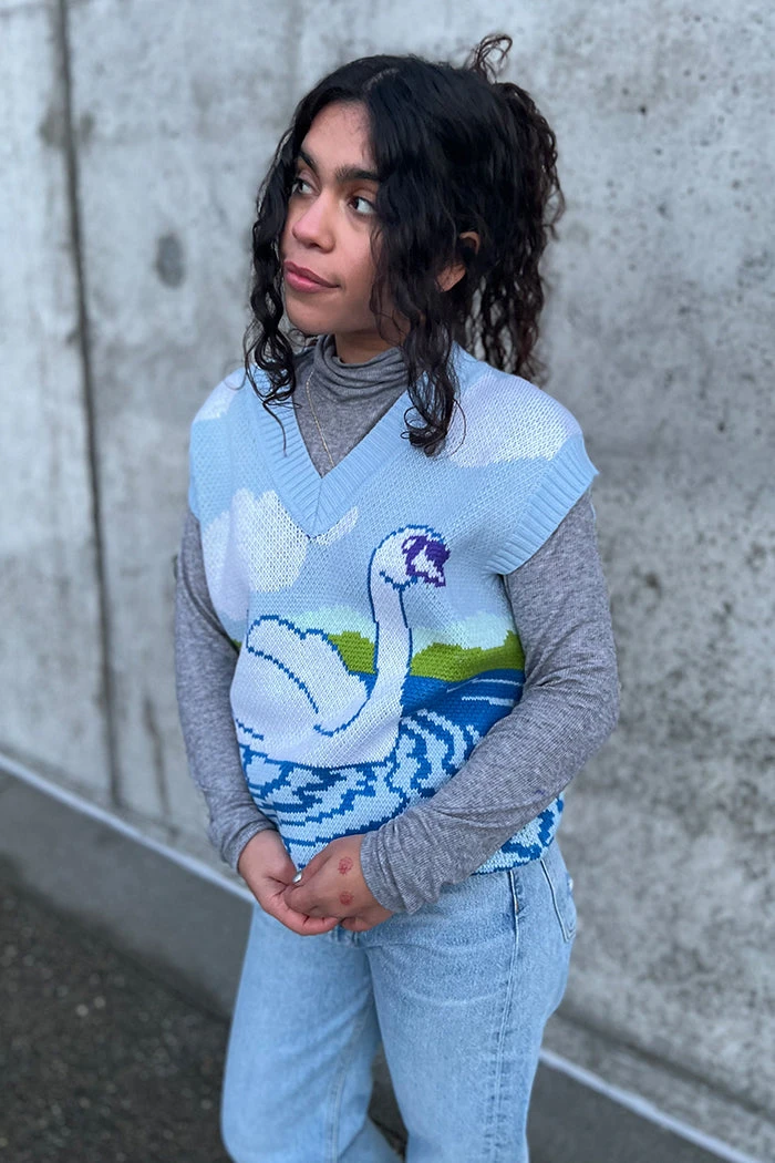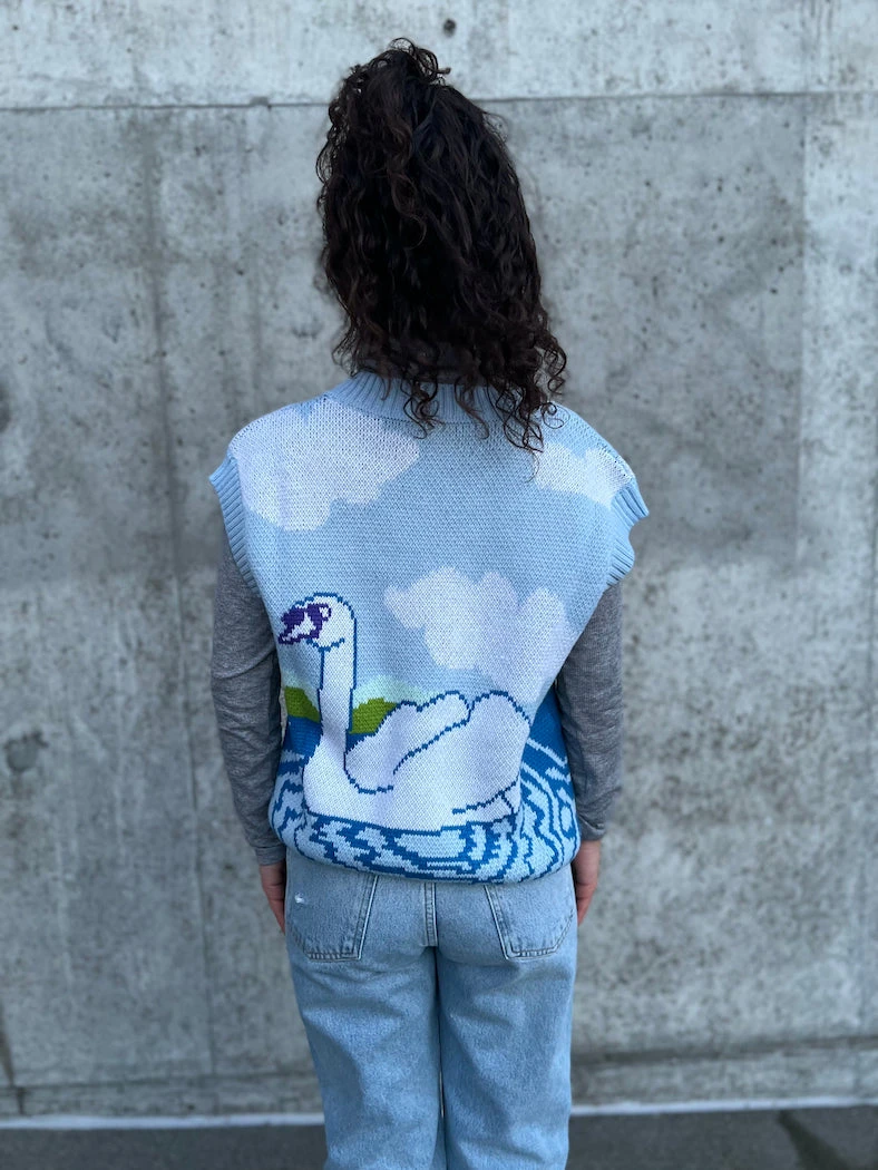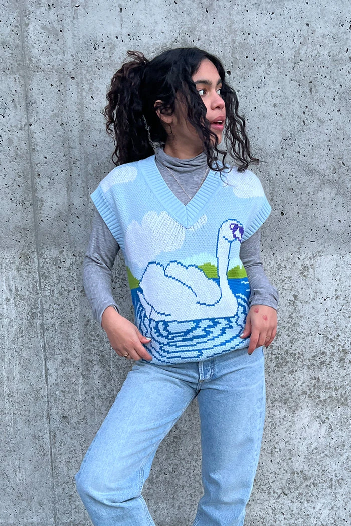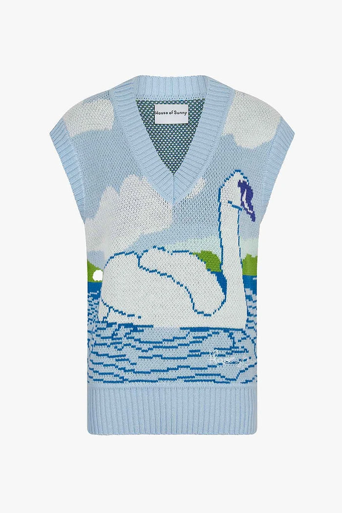 House of Sunny chunky retro Ride a White Swan sweater knit vest. This colorful vest features a large swan motif on an english lake.