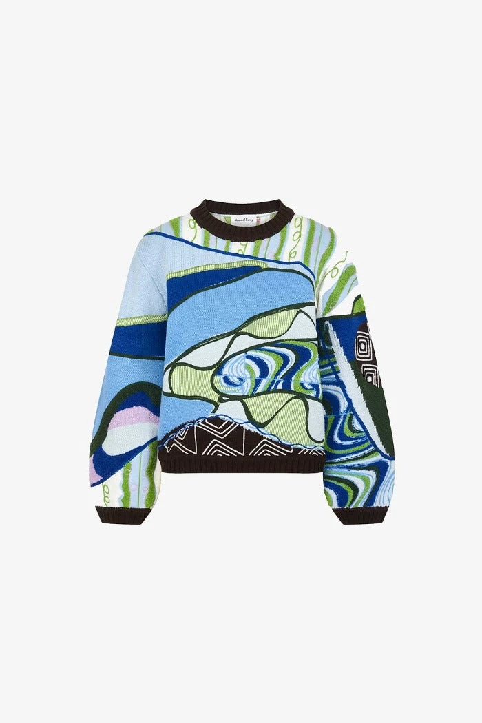 House of Sunny Hypnotise Landscape knit sweater. Hypnotically chaotic yet beautifully crafted. It has a familiar ribbed crewneck, cuffs and hem, alongside dropped shoulders for a loose fit. Smooth and ribbed knits, patchwork, embroidery and appliqué all clash together to form the landscape of your wildest dreams.