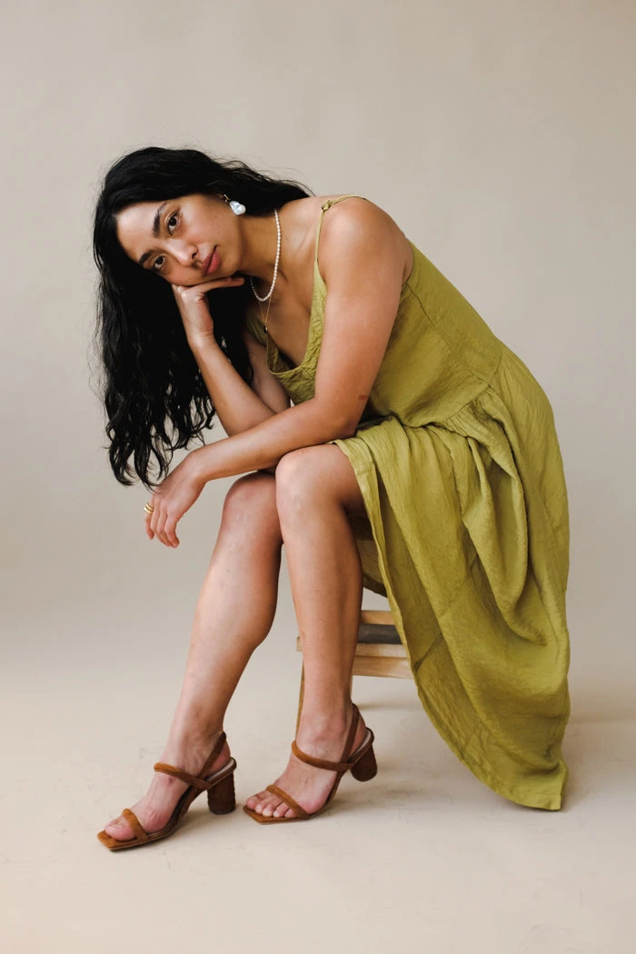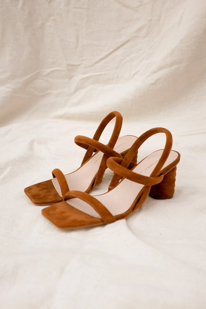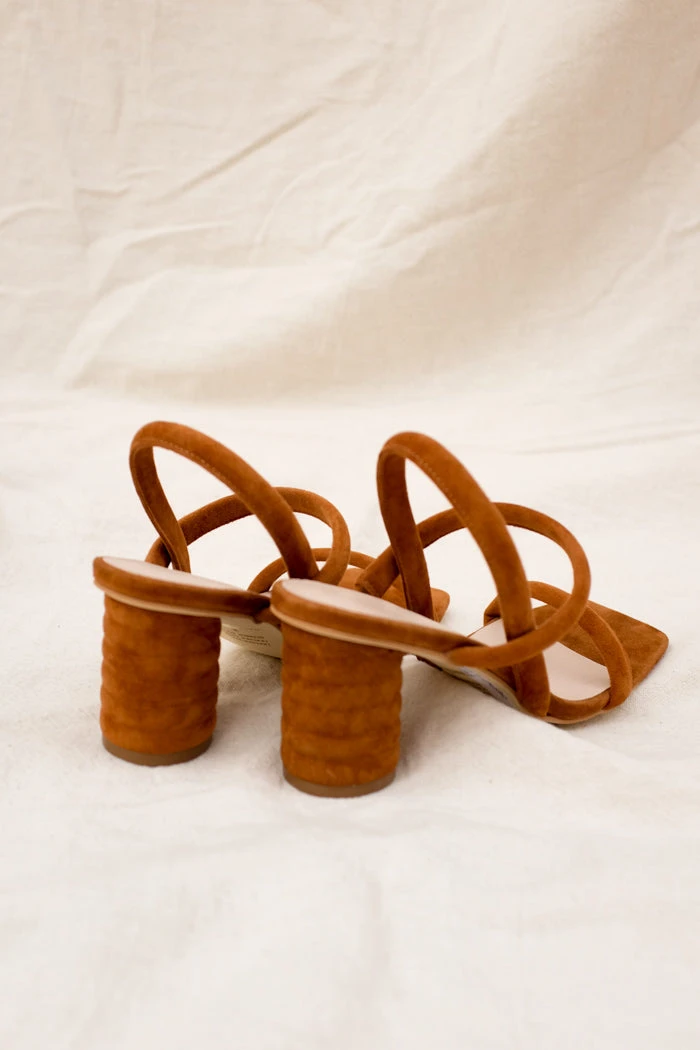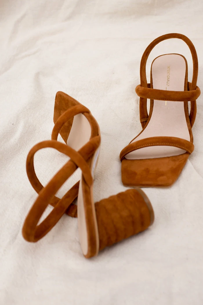 Intentionally Blank Kifton suede heeled sandal in chestnut brown. Combines puffy straps, and lots of exposed foot to create a flattering and elongating shape.