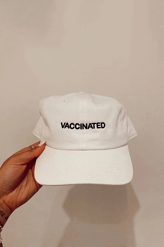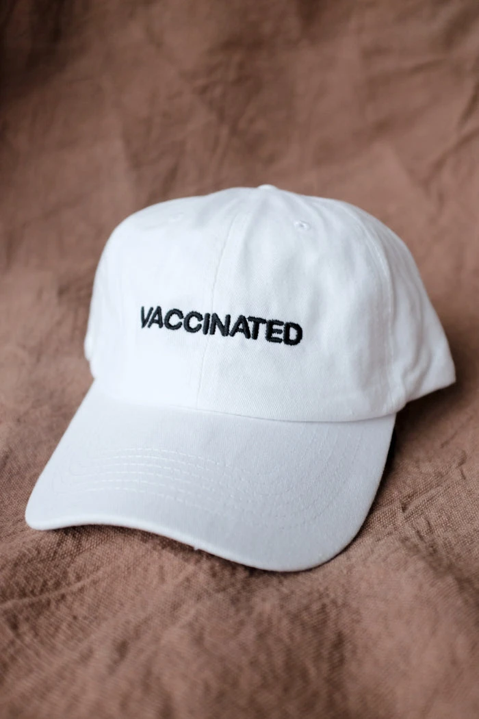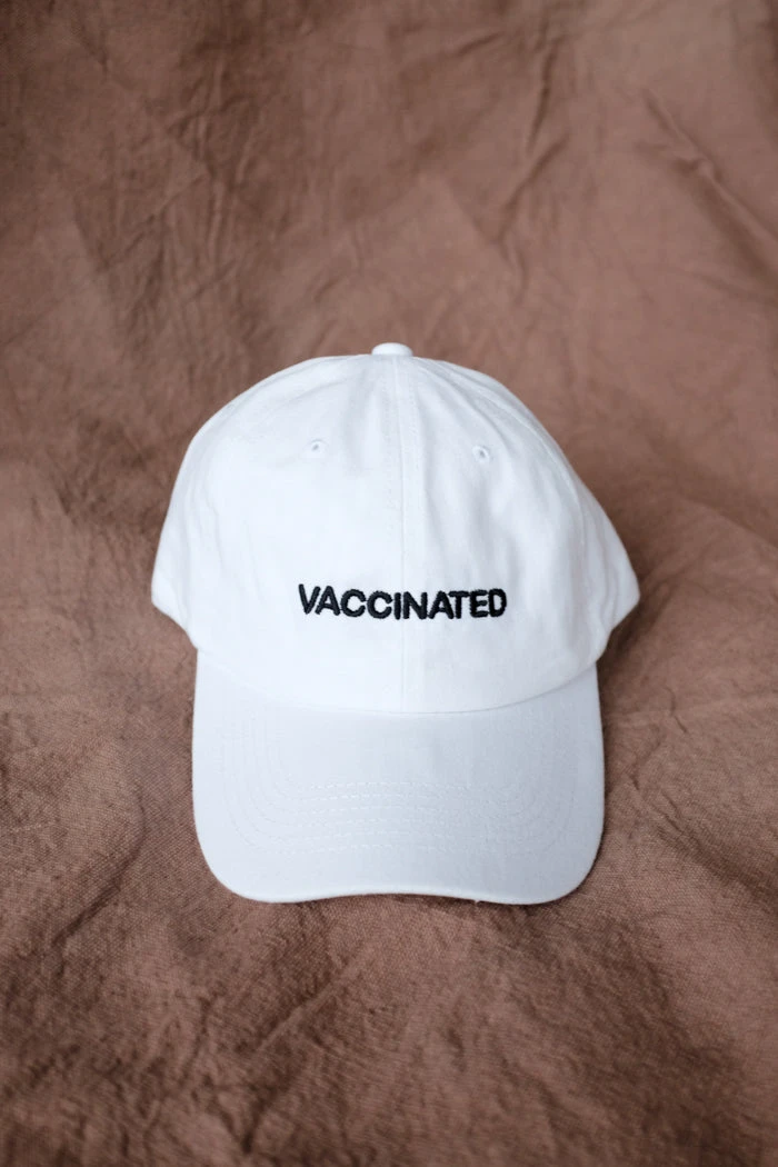 Vaccinated embroidered white hat with black writing.