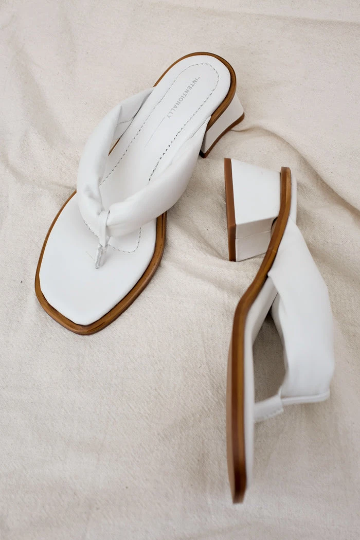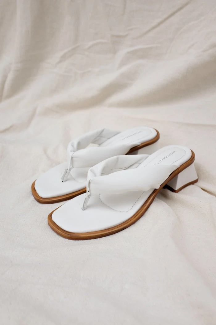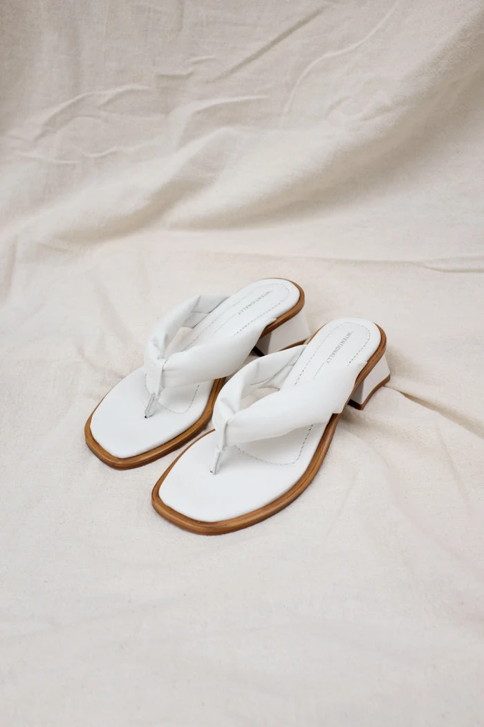 Intentionally Blank Whitman sandals in white exclusively made for Pipe and Row. The ultimate puff daddy, the whitman thong is so chic on the foot, with oversized, over puffed straps and the perfect sculptural heel. Soft leather straps, padded foot bed.