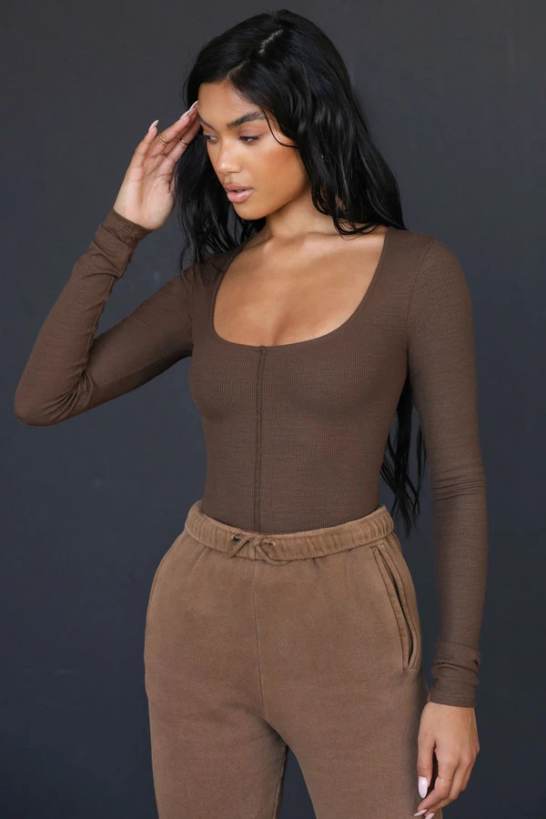 Joah Brown classic scoop long sleeve ribbed top in brown.