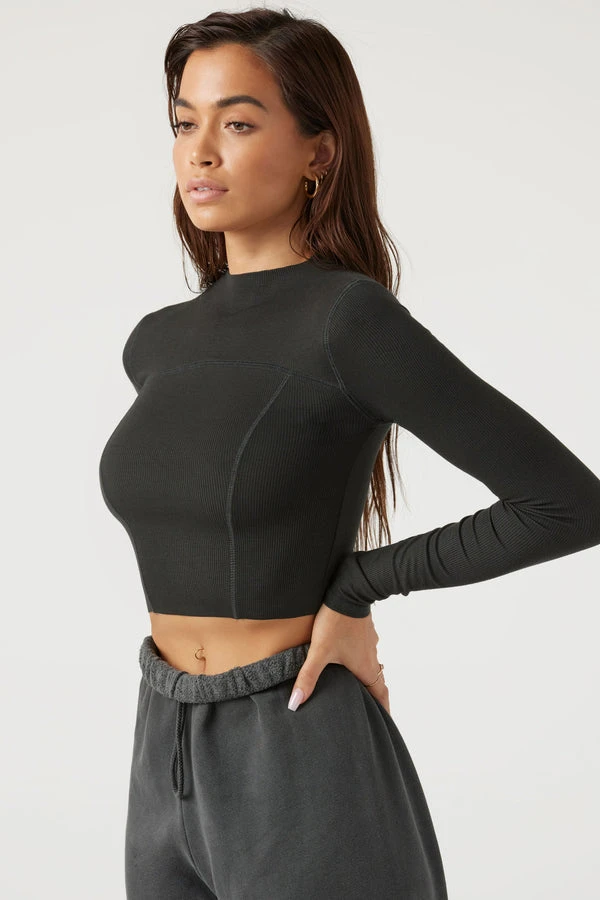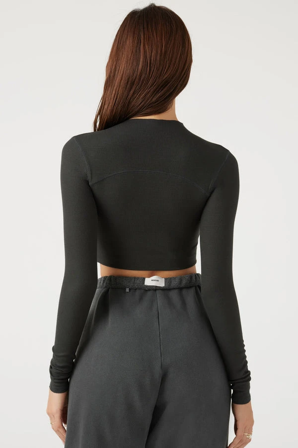 Joah Brown Contrast Stitch long sleeve cropped ribbed top with mini mock neck in vintage black.