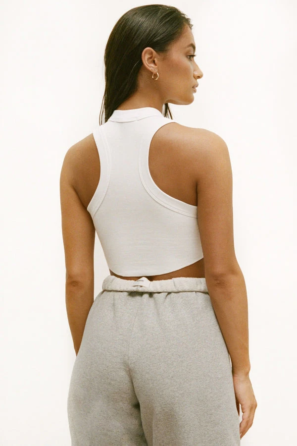 Joah Brown crop rib body tank in white. Featuring an exaggerated high crew neckline and curved hem.