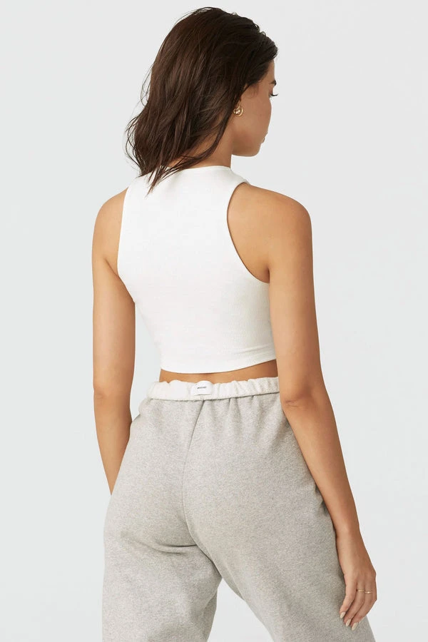Joah Brown high neck Lace up crop tank in white rib and adjustable drawstring. This tank is in the the JB custom flexrib fabric, designed with comfort and function in mind. It’s soft, stretchy and made to move with you.