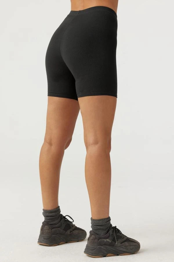Joah Brown mid length, high rise bike shorts with narrow waistband in ribbed black. Soft, stretchy, comfortable fabric made to move with you.