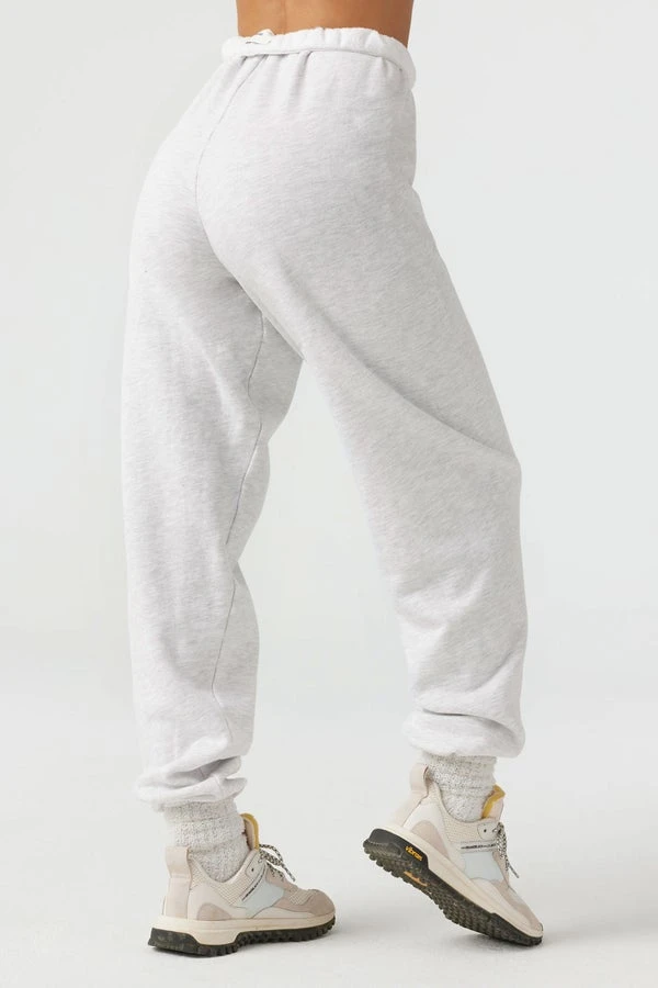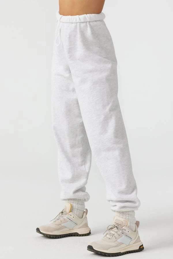 Joah Brown oversized jogger sweatpants with an elastic waistband and gathered ankle cuffs in pearl grey. Adjustable hidden drawstring at waist. Brushed mid-weight cotton, comfortable and made to last.