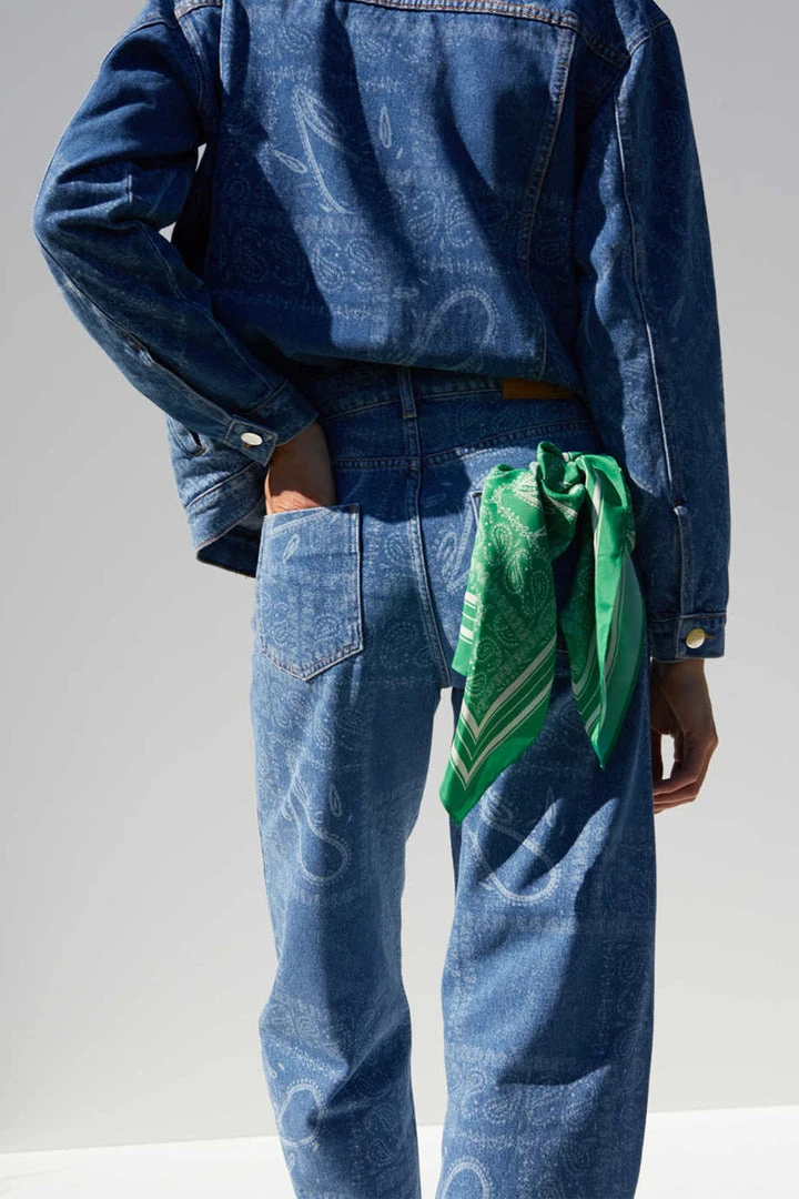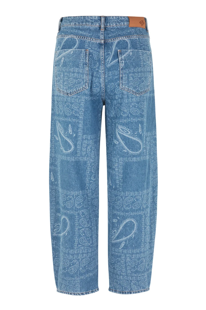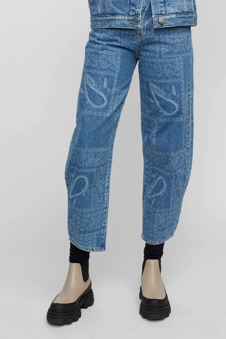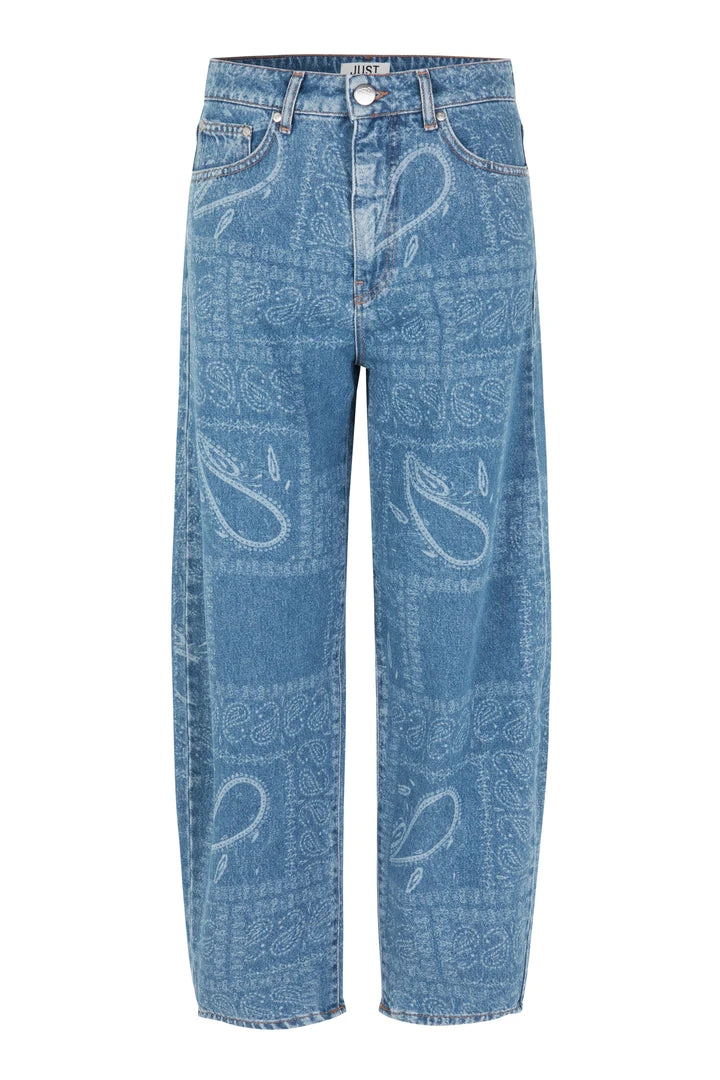 Just Female all over paisley print Bold denim jeans. The fit is high-rise with bowed legs that cut above the ankle. Pair with the swift denim jacket for a full look.