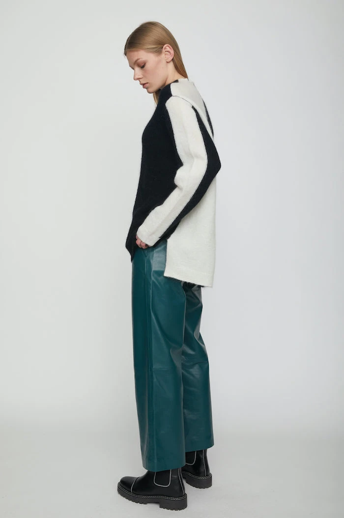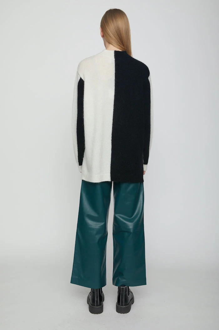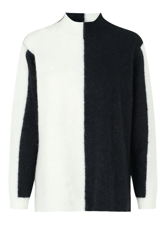 Just Female Cobra certified mohair and wool mock neck sweater, with two toned buttercream and black. Slits on each side of bottom and a thin rib rib at edges.